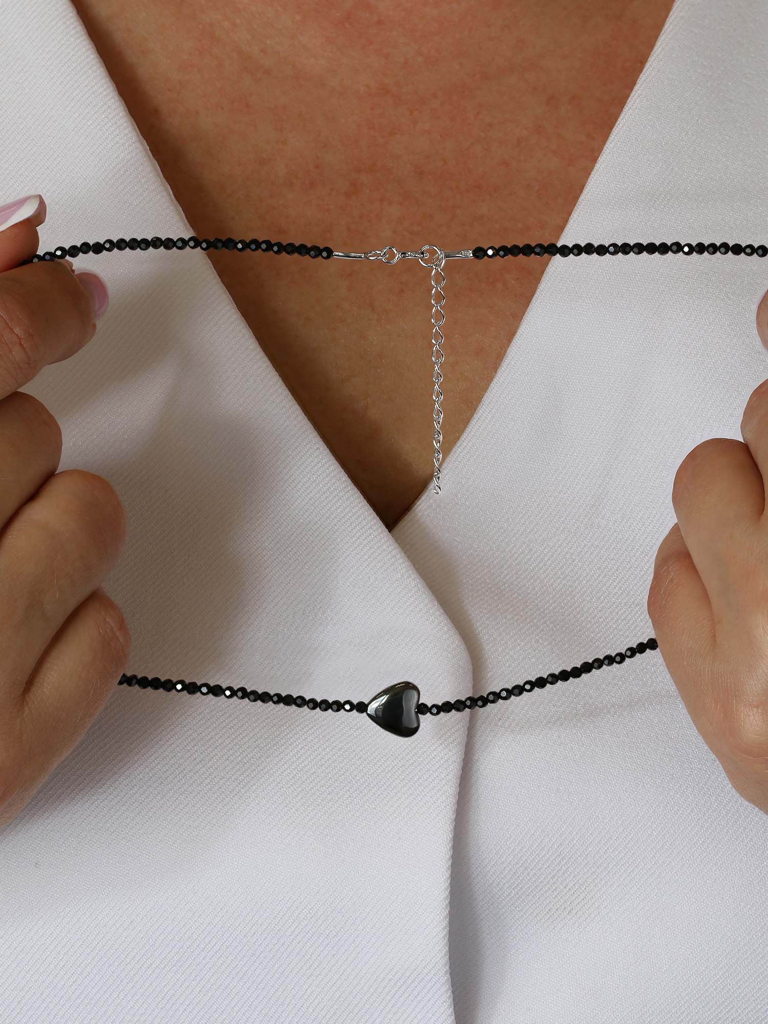Браслет из серебра с гематитом и чёрной шпинелью родированный - Сердце 925 пробы Бр-01счб