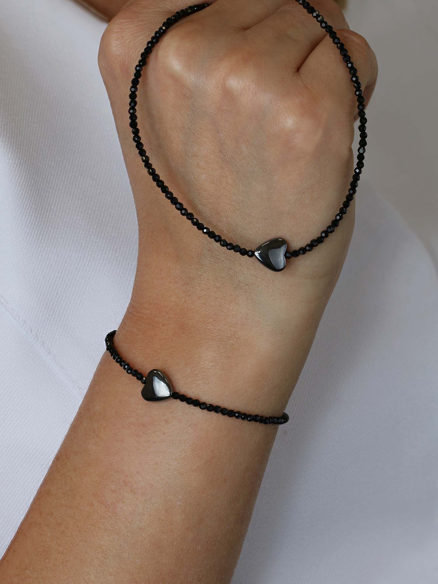 Браслет из серебра с гематитом и чёрной шпинелью родированный - Сердце