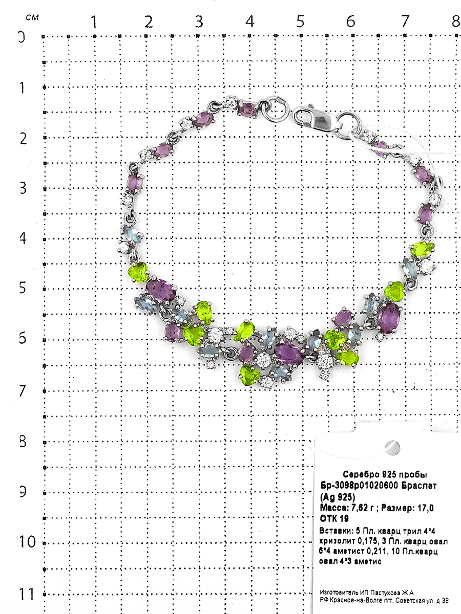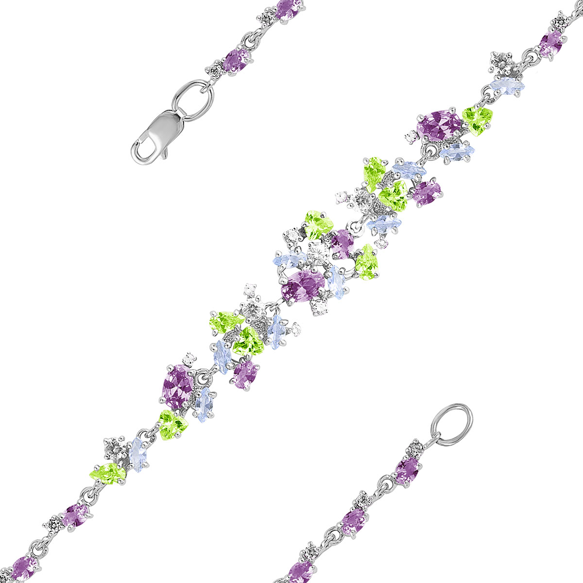 Браслет из серебра с пл.кварцем цв.хризолит, аметист, sky топаз и фианитами родированный Бр-3098р01020600