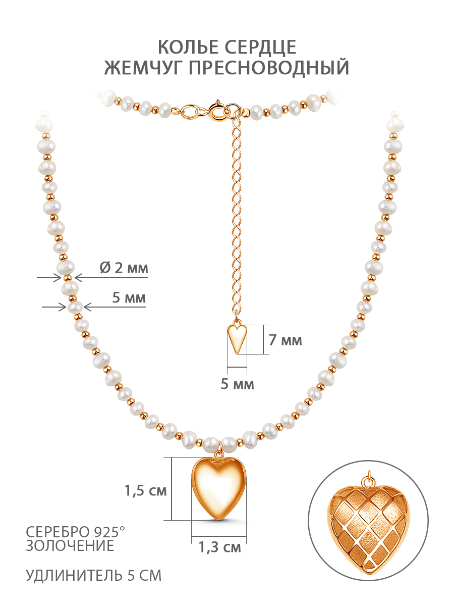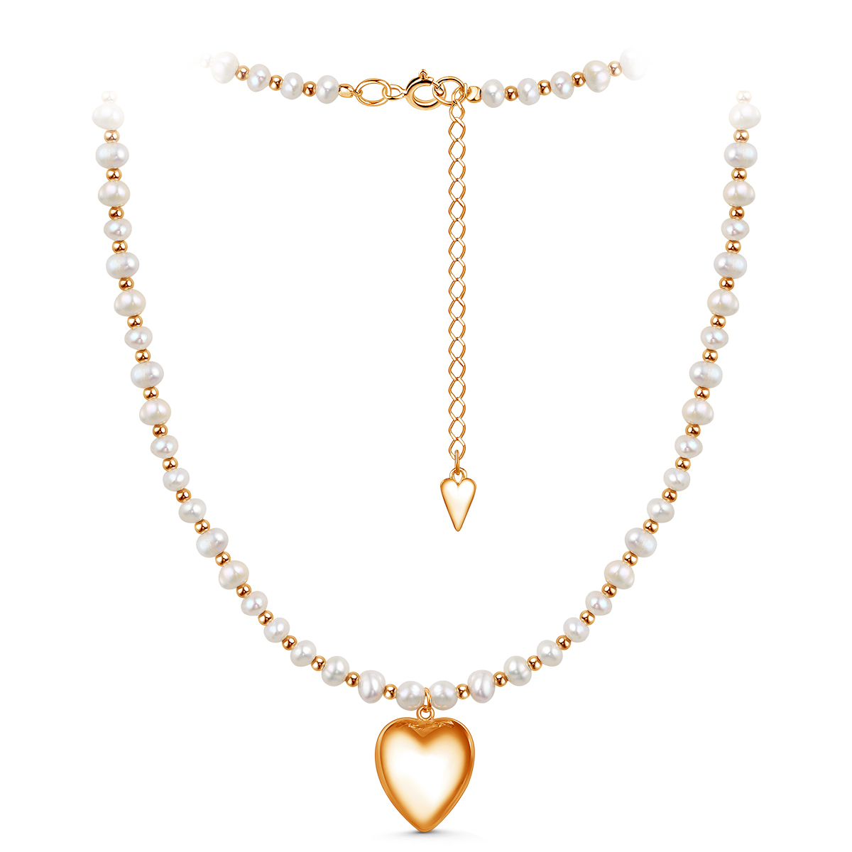 Колье из золочёного серебра с пресноводным культивированным жемчугом - Сердце, 39 (+5) см