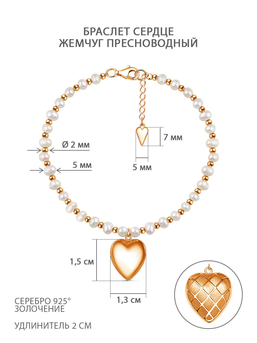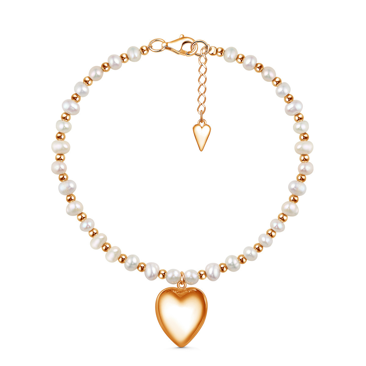 Браслет из золочёного серебра с пресноводным культивированным жемчугом - Сердце
