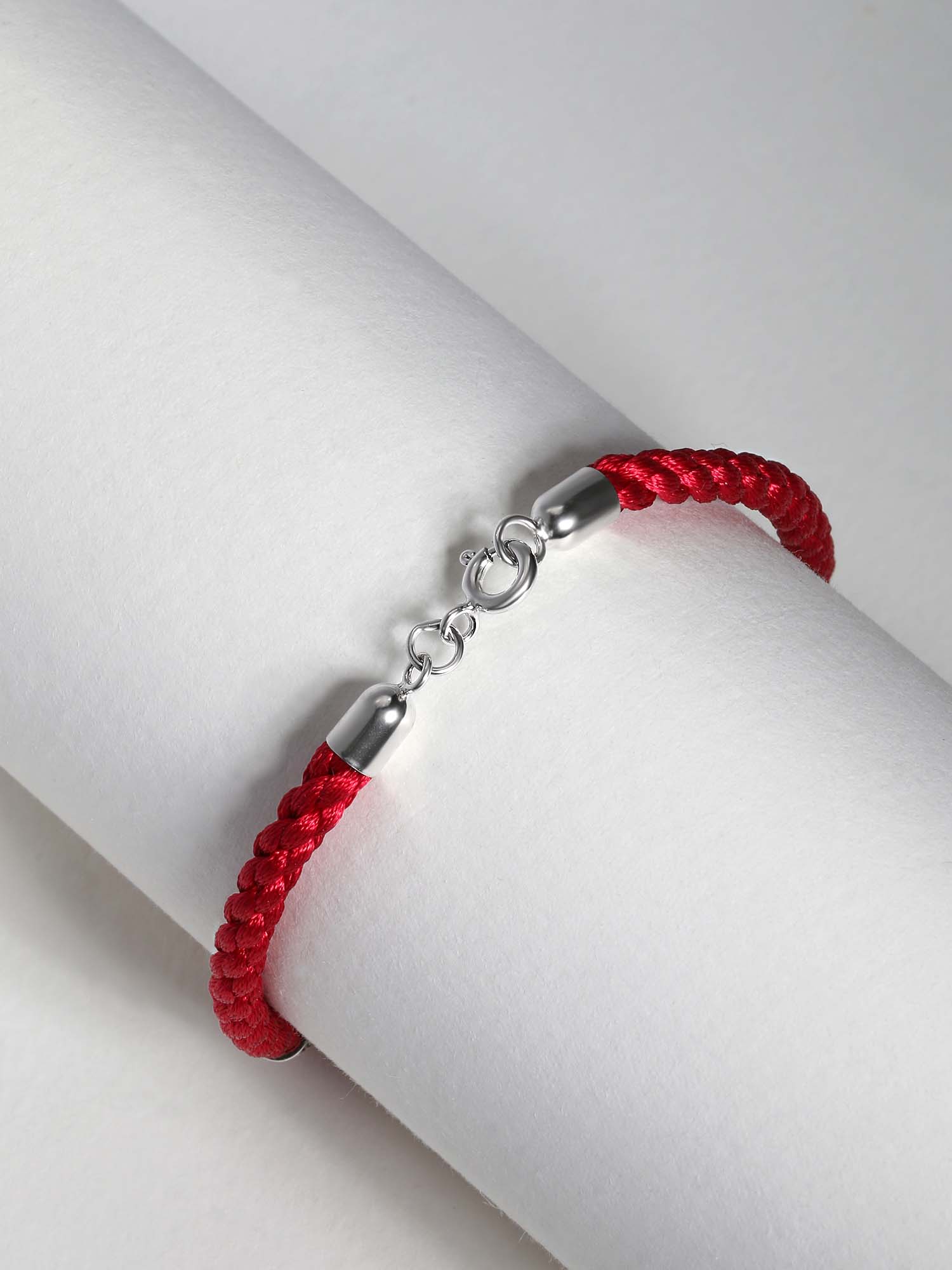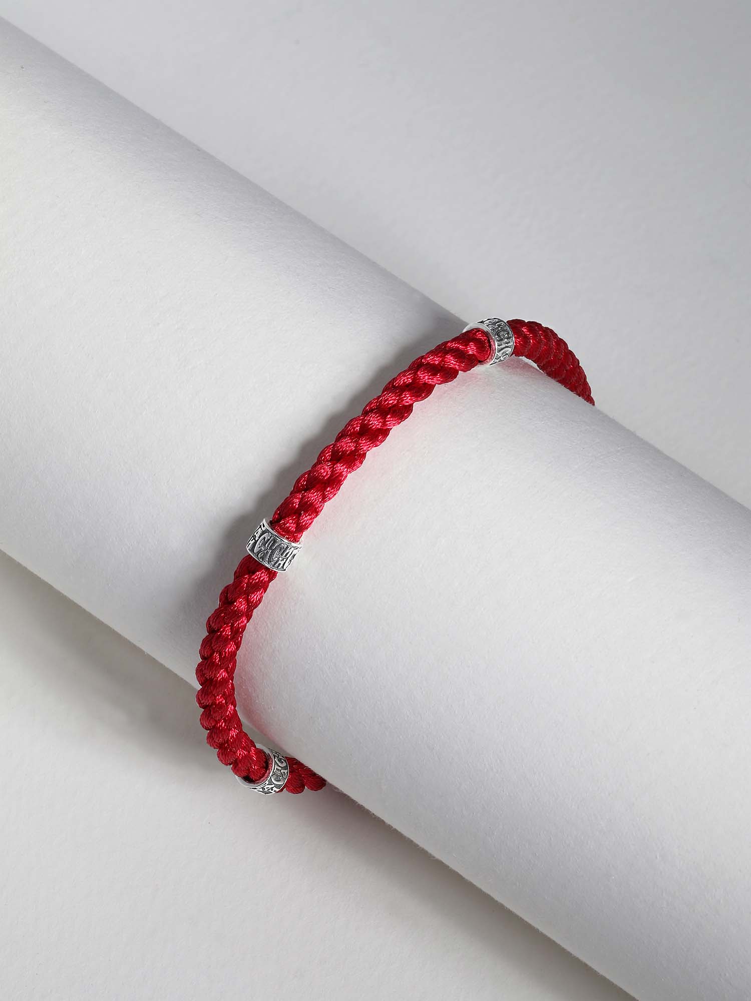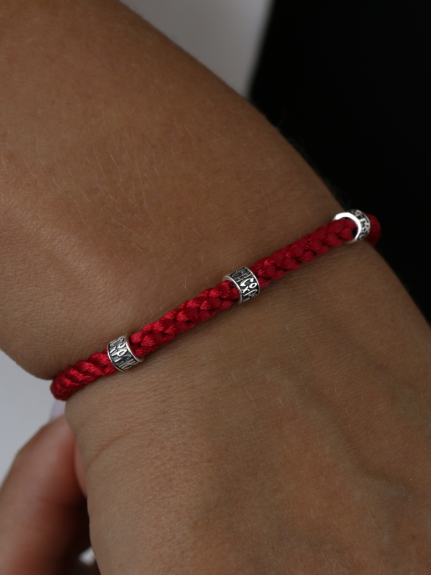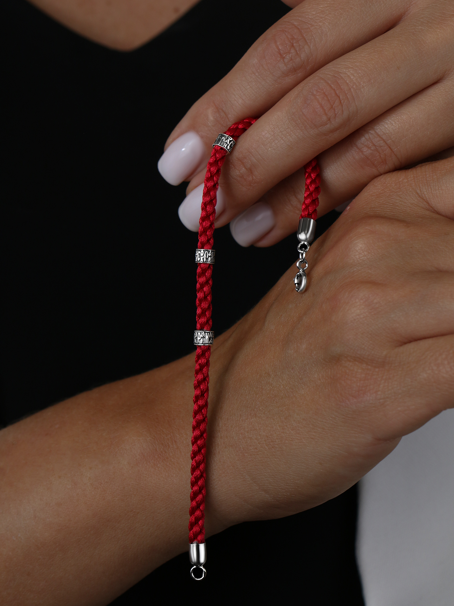 Браслет красный текстильный с подвижными элементами из чернёного серебра - Спаси и сохрани