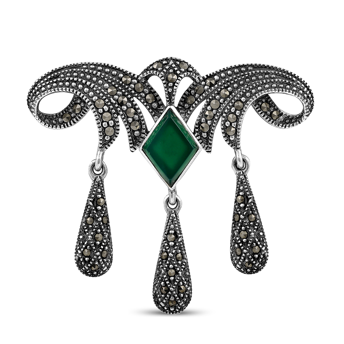 Брошь из чернёного серебра с нат.зеленым агатом и марказитами