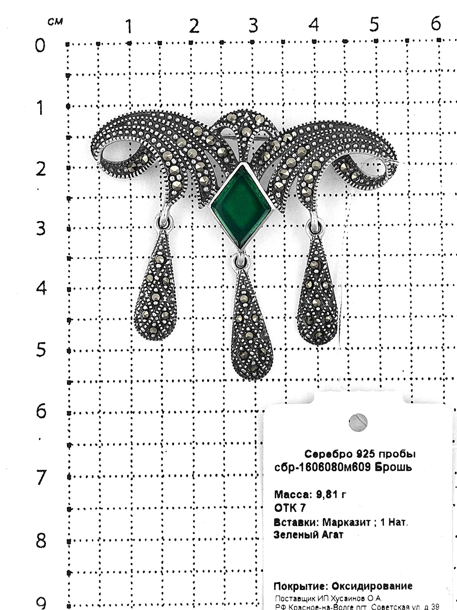Брошь из чернёного серебра с нат.зеленым агатом и марказитами сбр-1606080м609