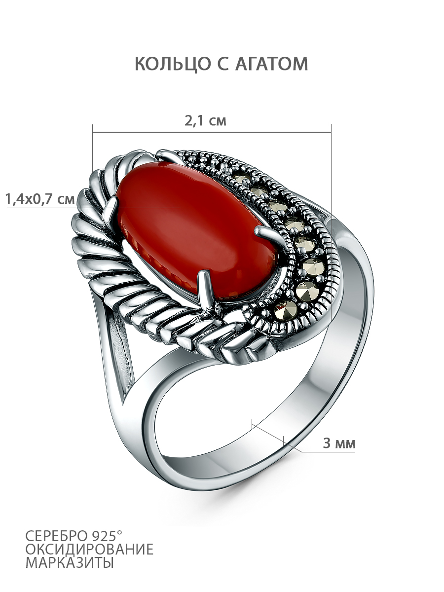 Кольцо из чернёного серебра с агатом и марказитами 925 пробы HR1512-RD