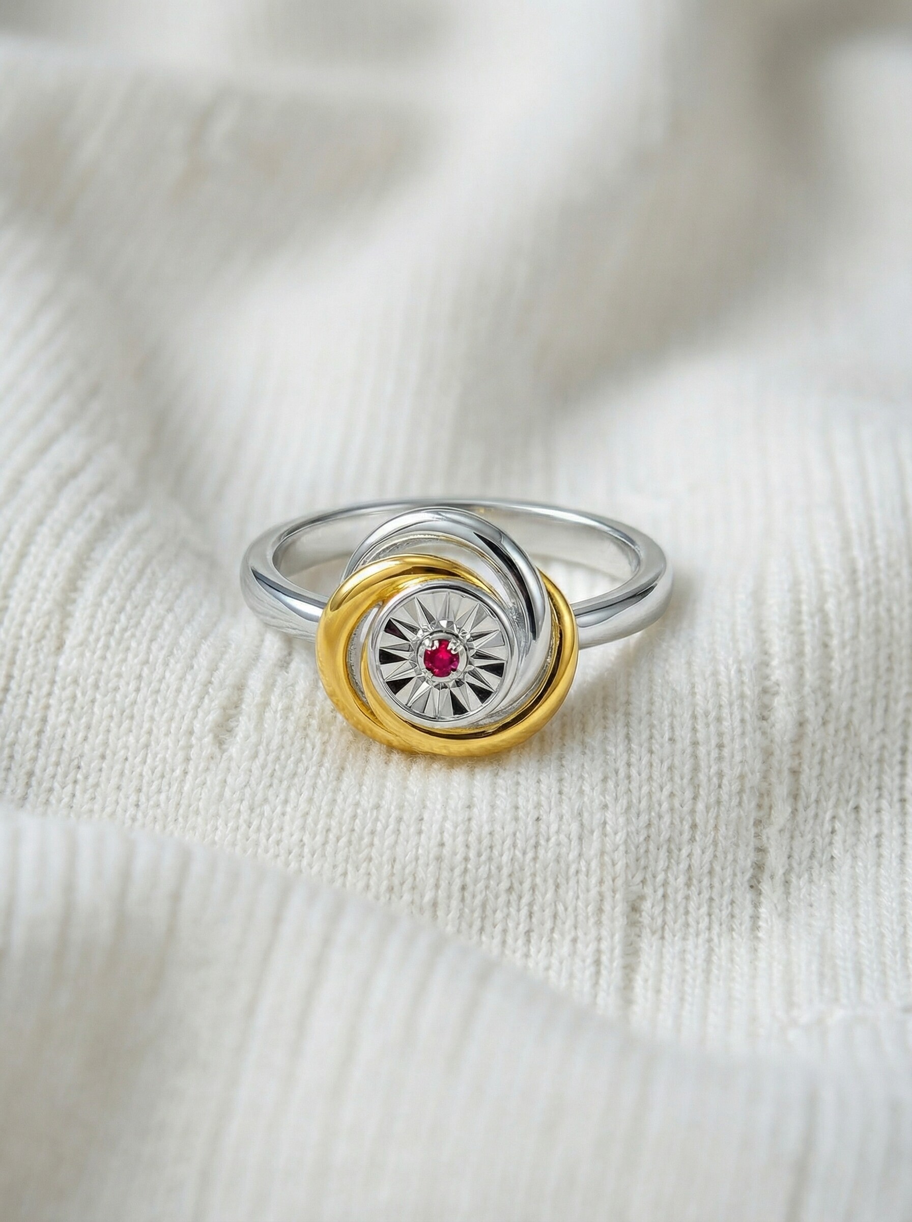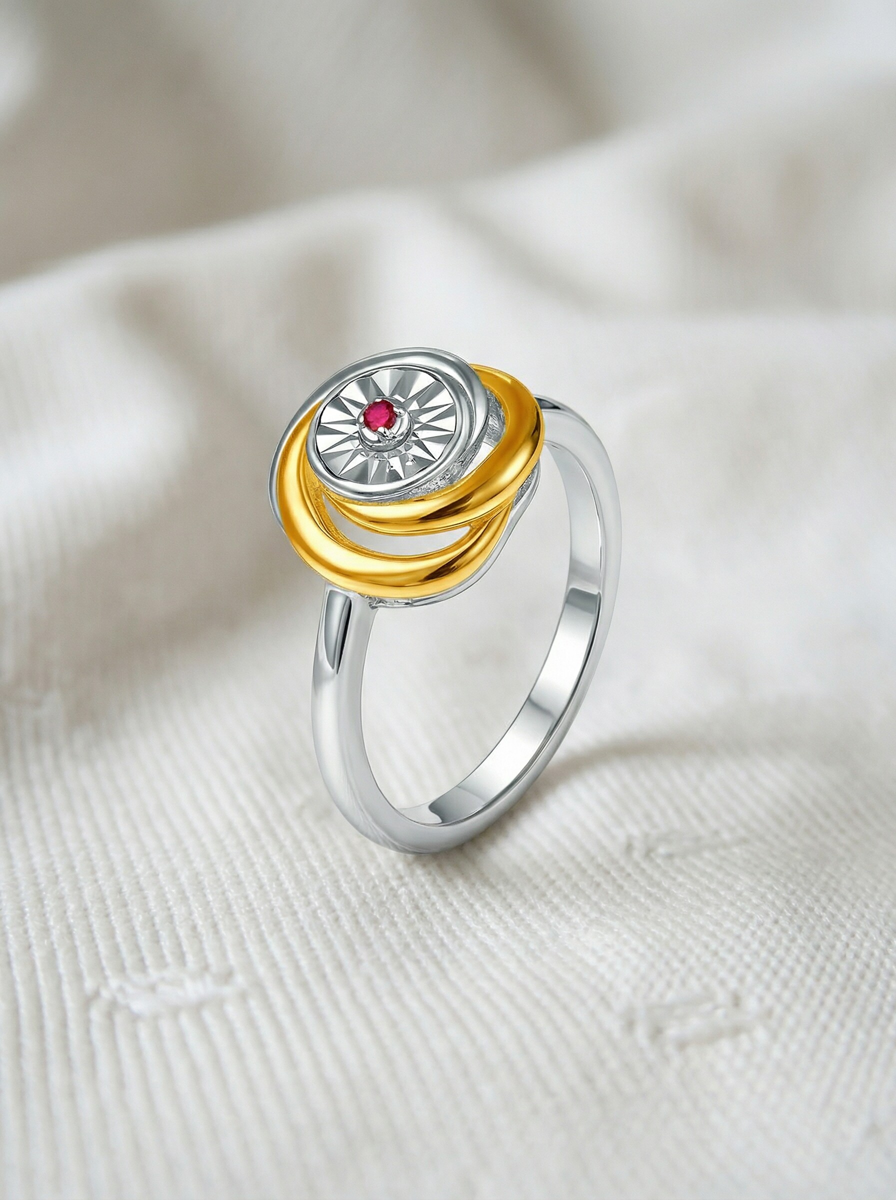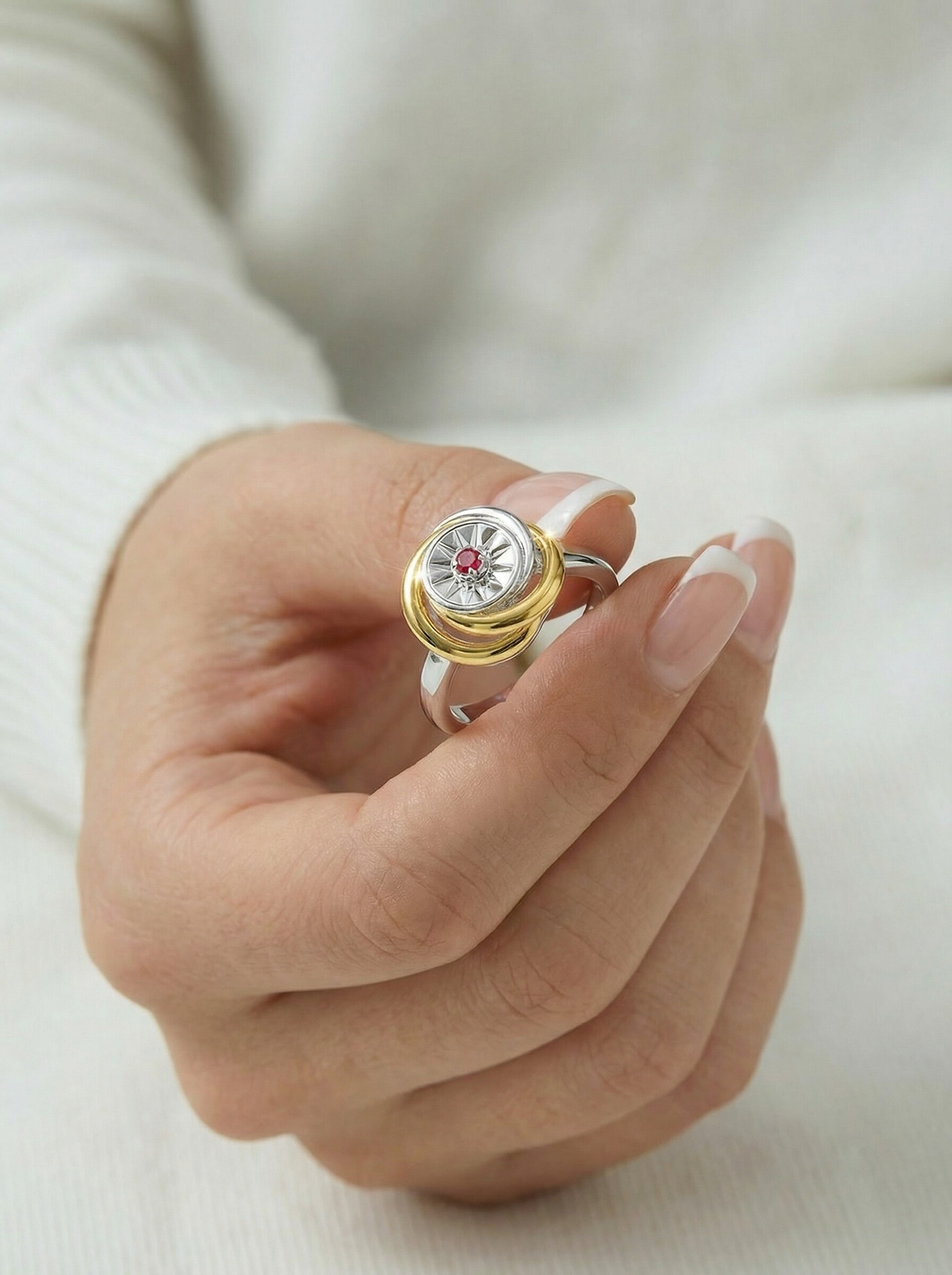 Кольцо из родированного серебра с рубином и лимонным золочением
