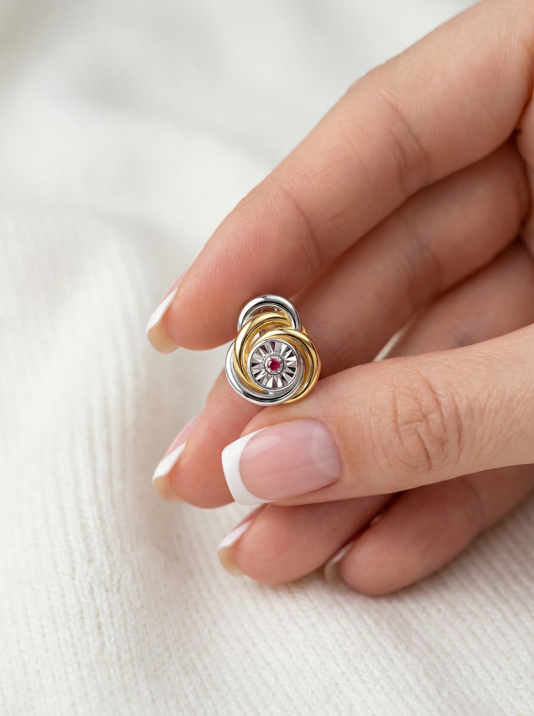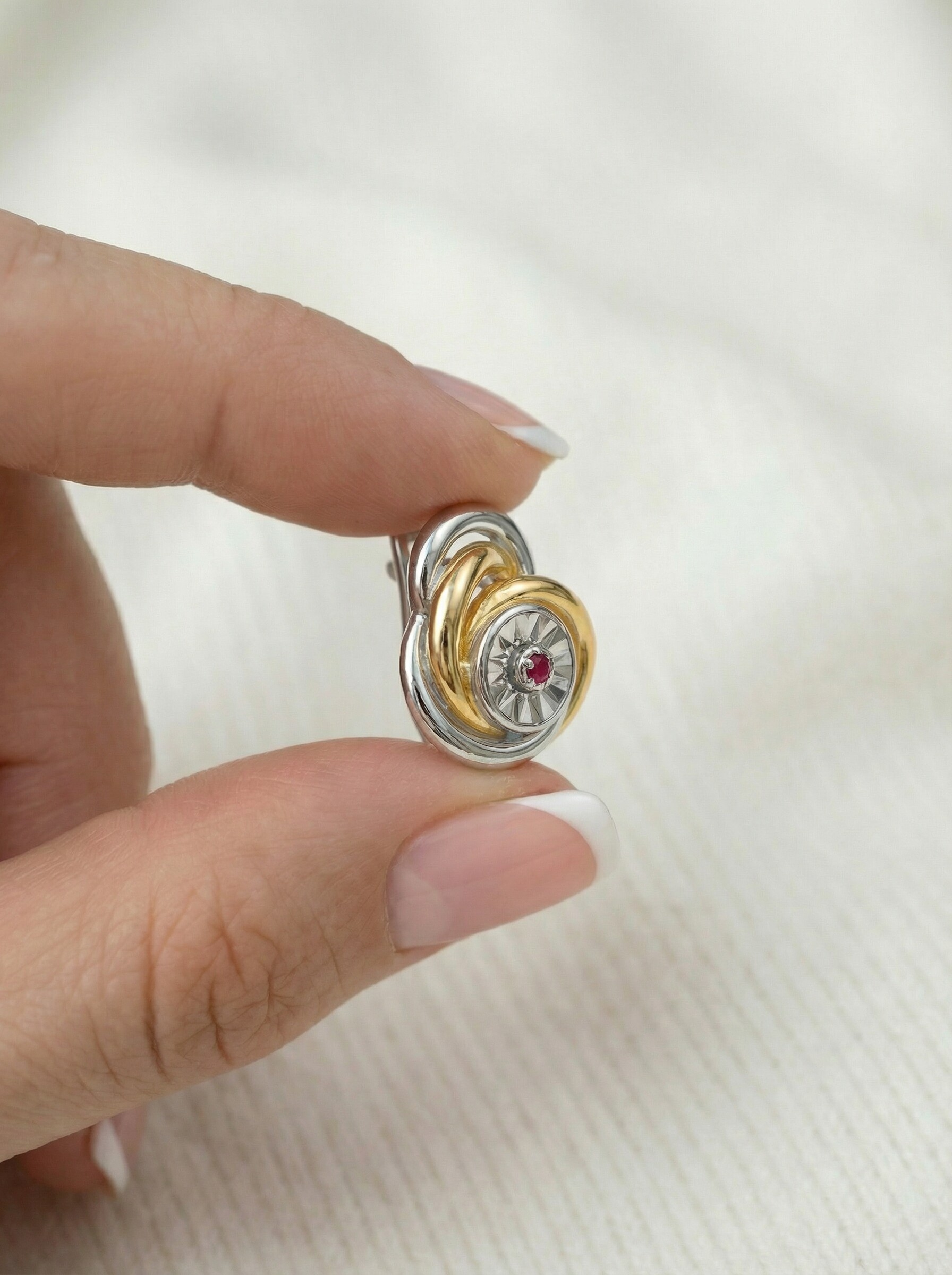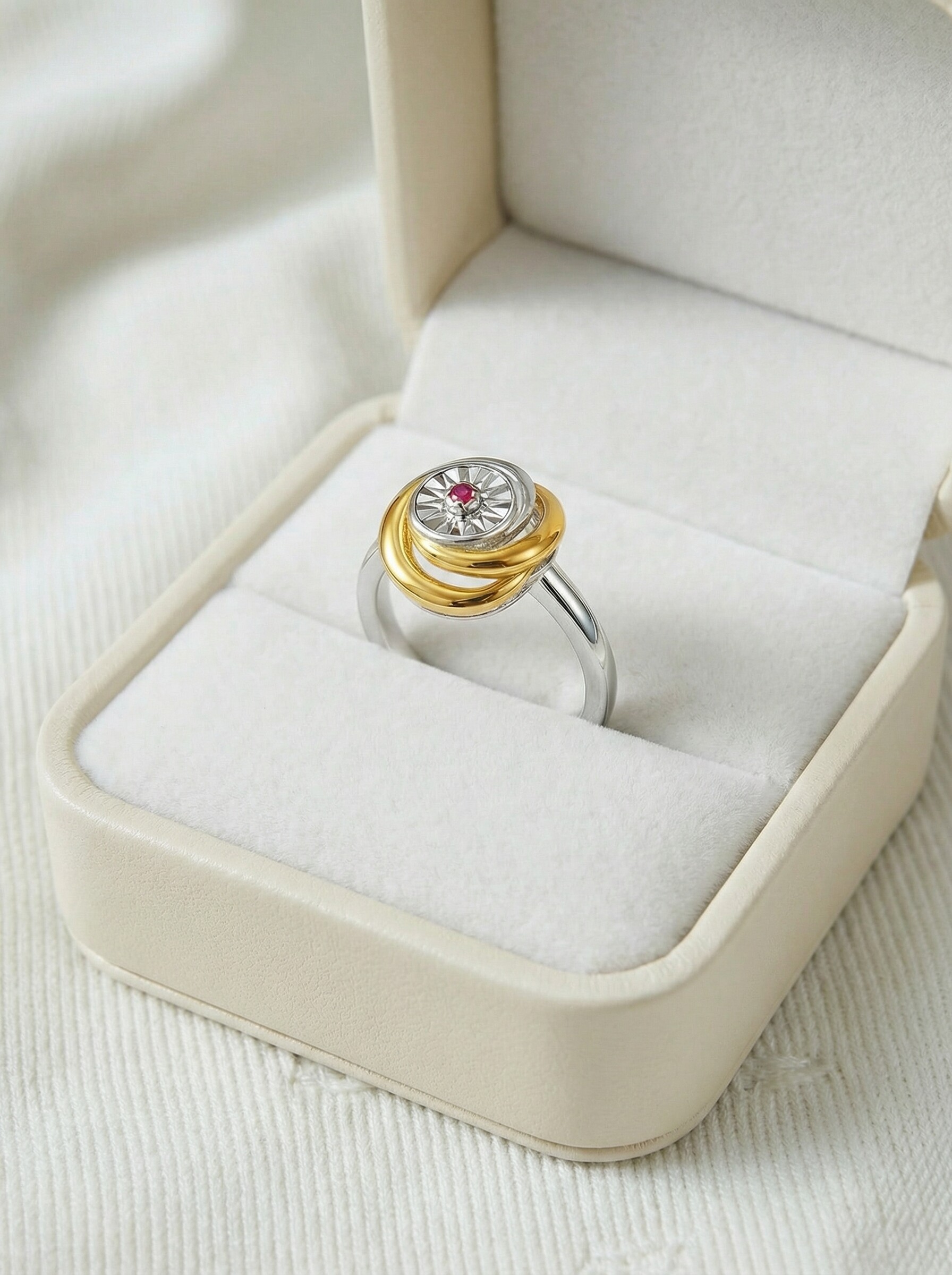 Кольцо из родированного серебра с рубином и лимонным золочением
