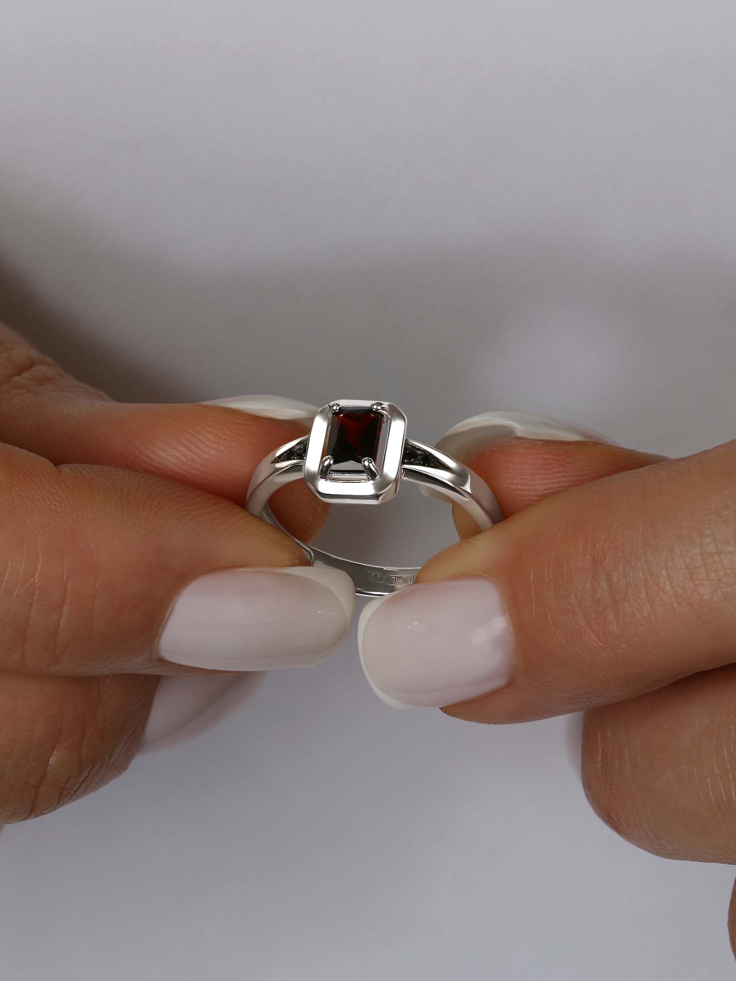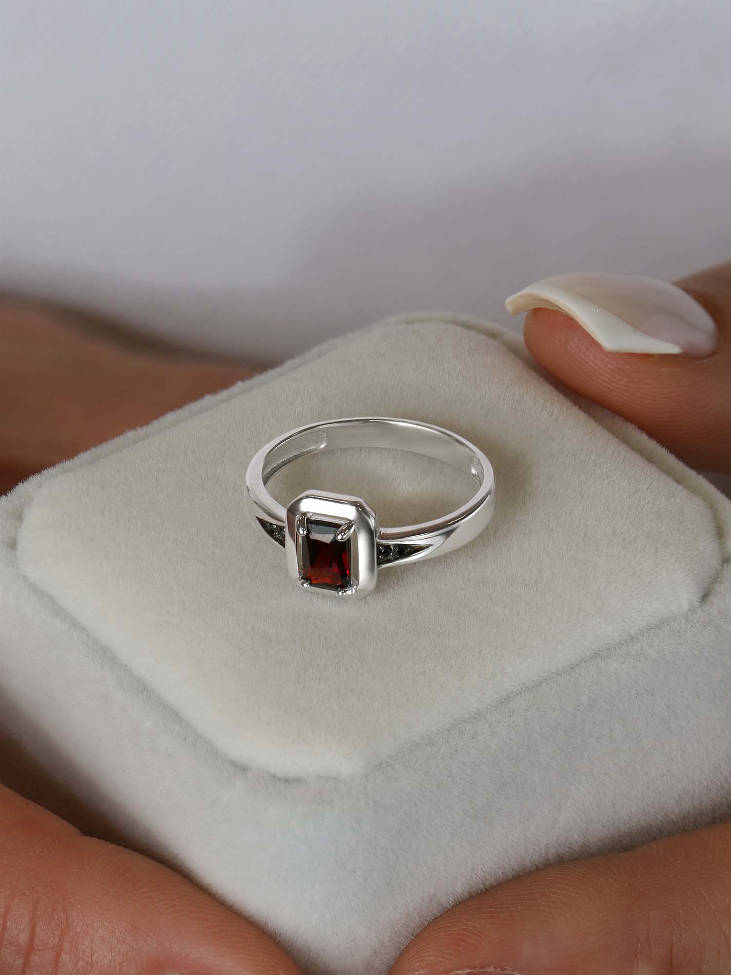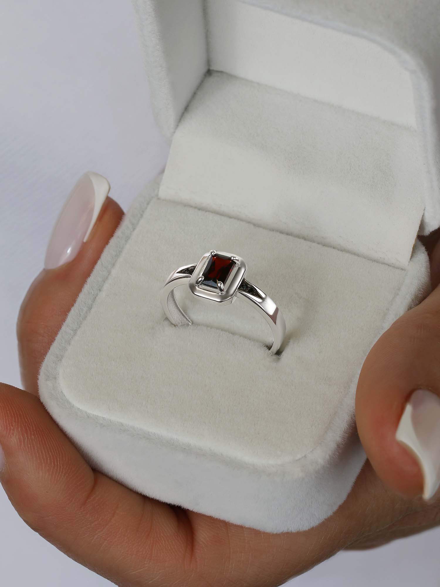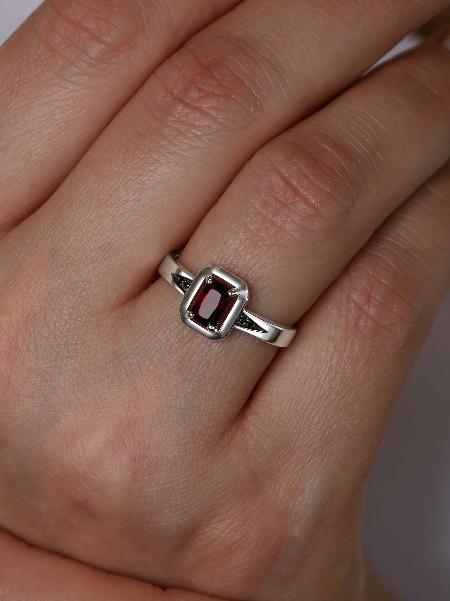 Кольцо из серебра с гранатом и фианитами родированное