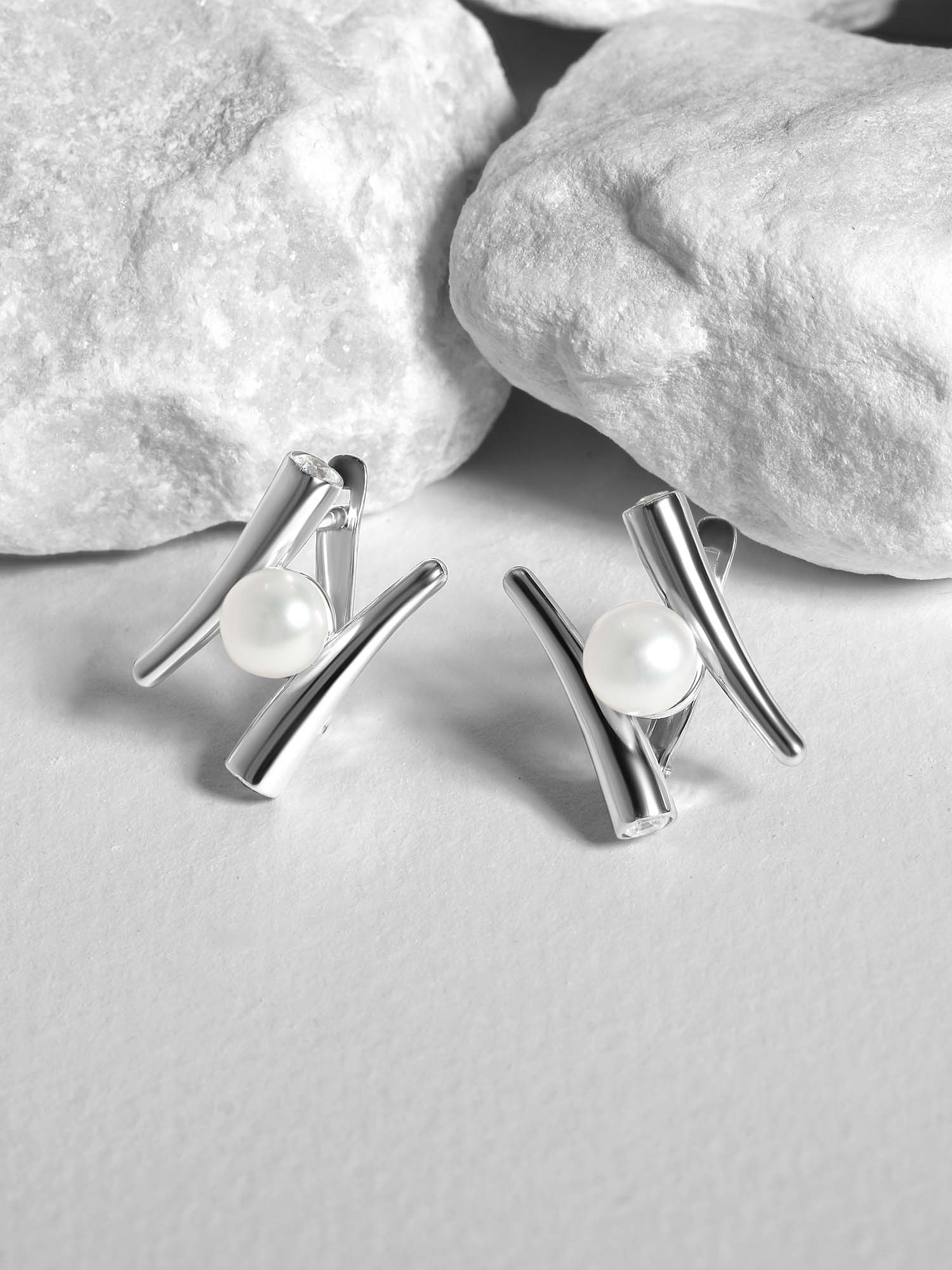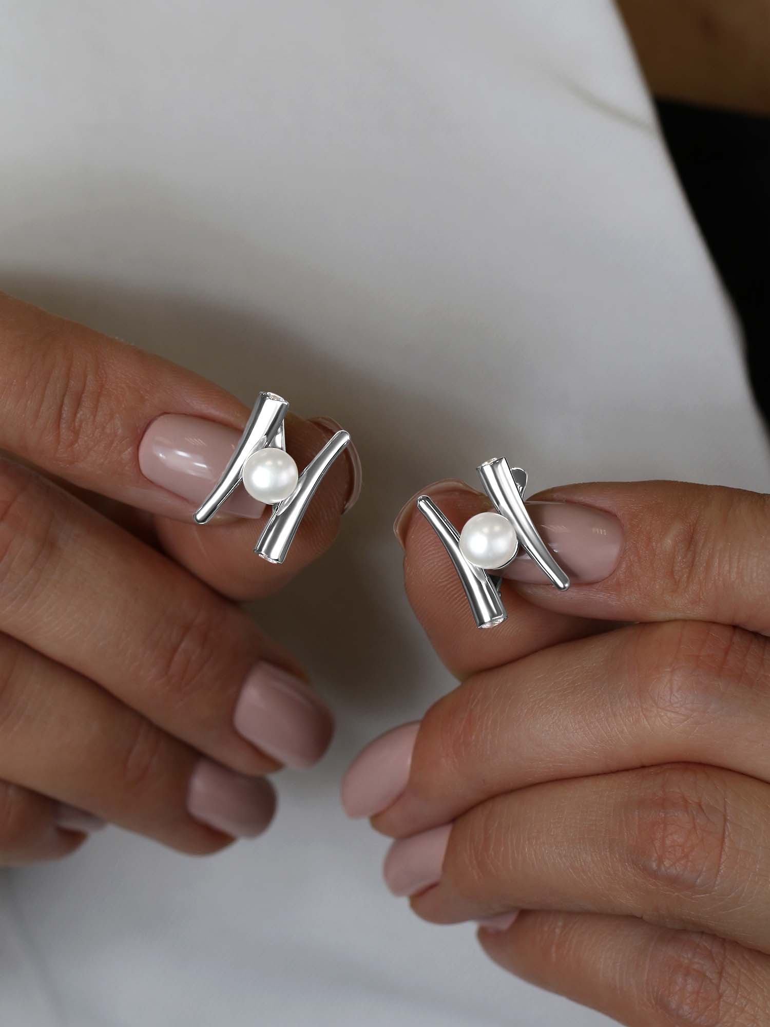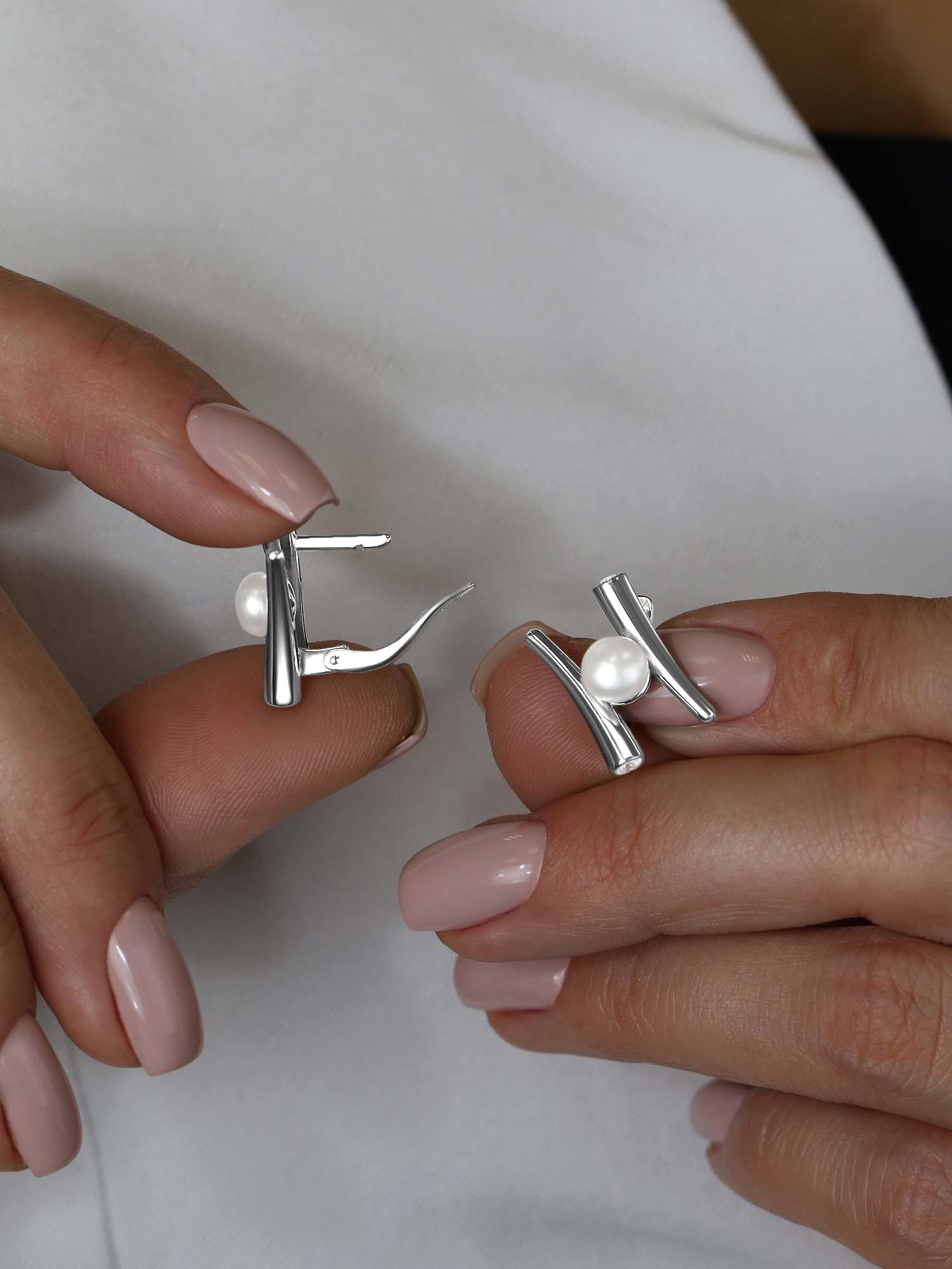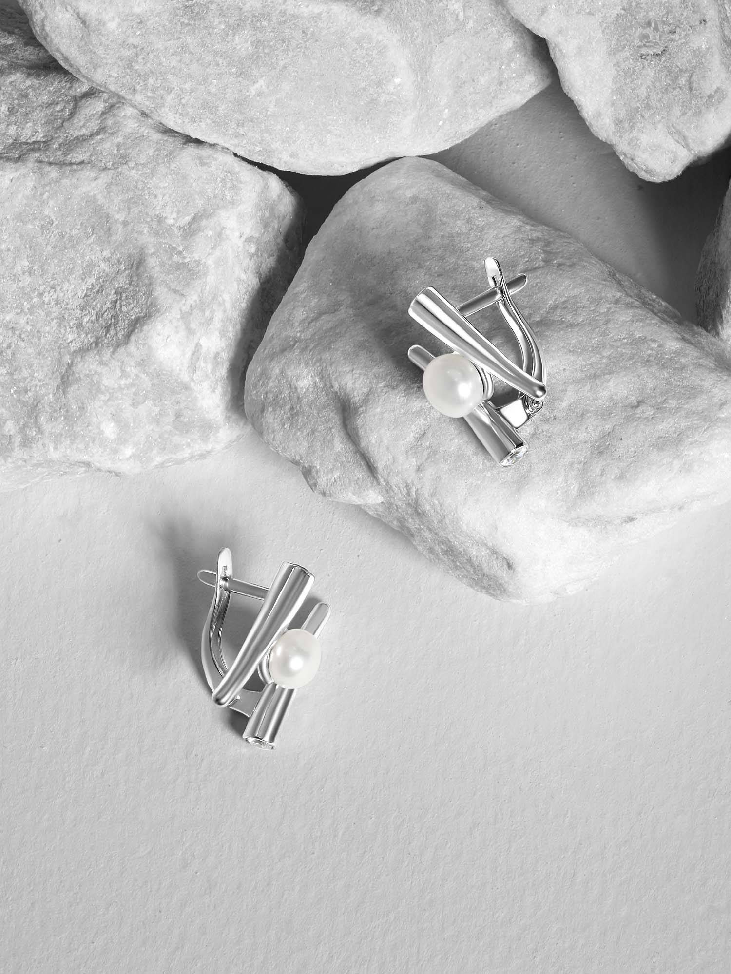 Серьги из серебра с культивированным жемчугом и фианитами родированные