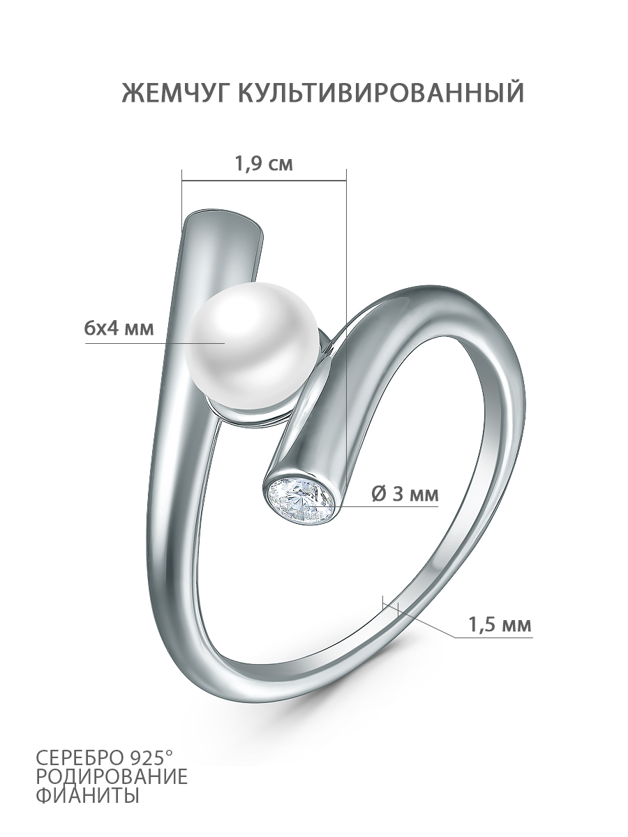 Кольцо из серебра с культивированный жемчугом и фианитами родированное 211-10-331р