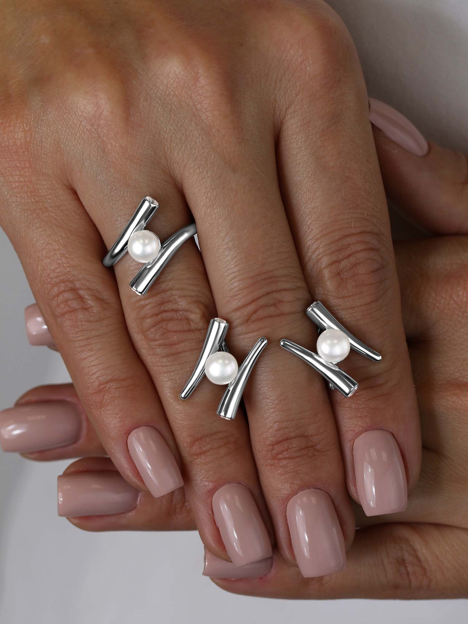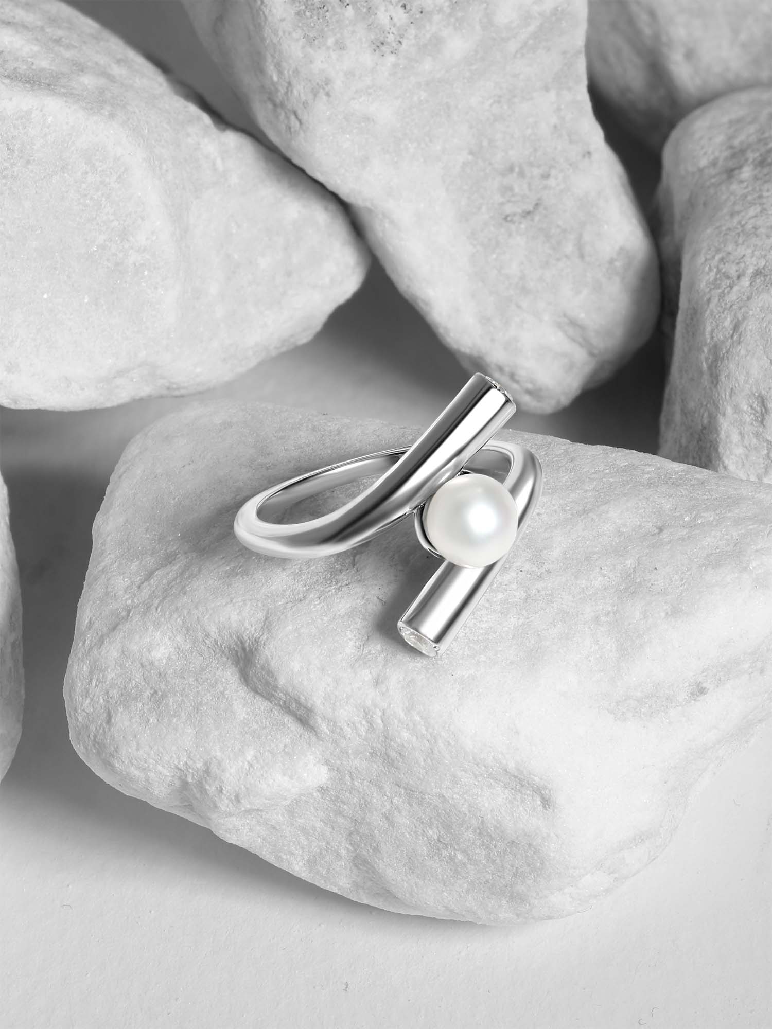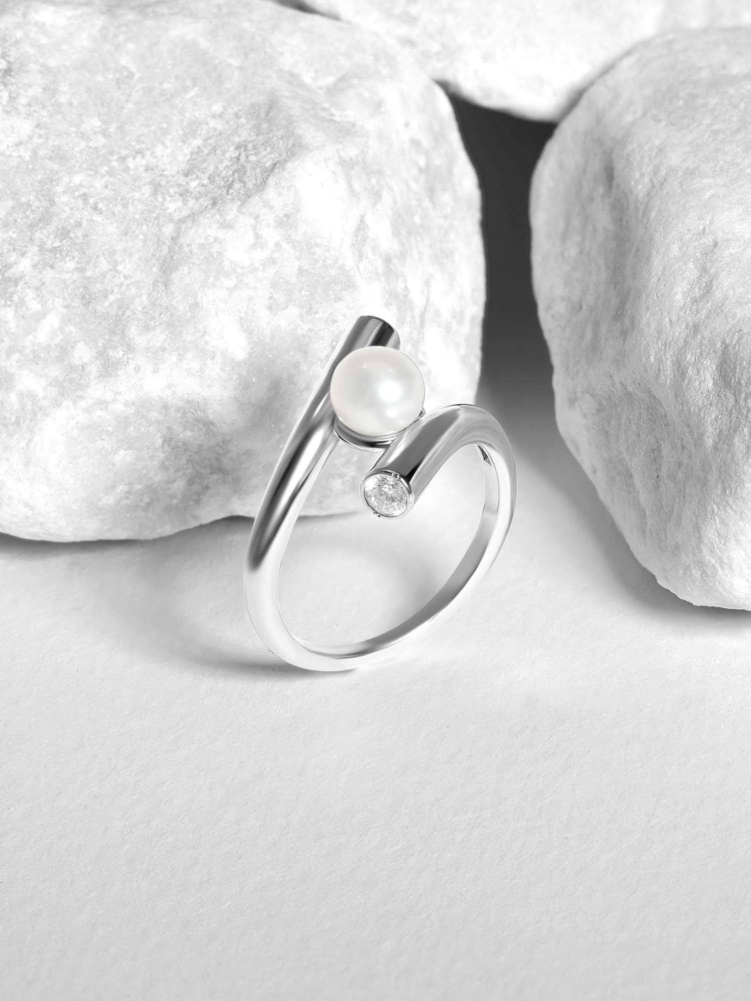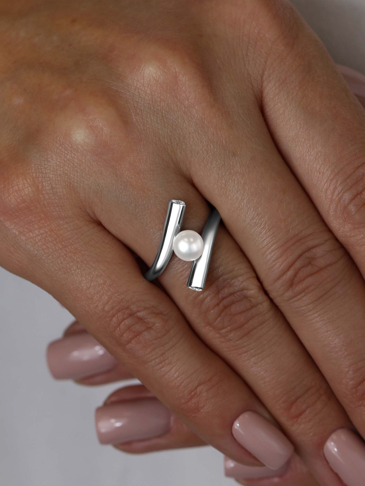 Кольцо из серебра с культивированный жемчугом и фианитами родированное