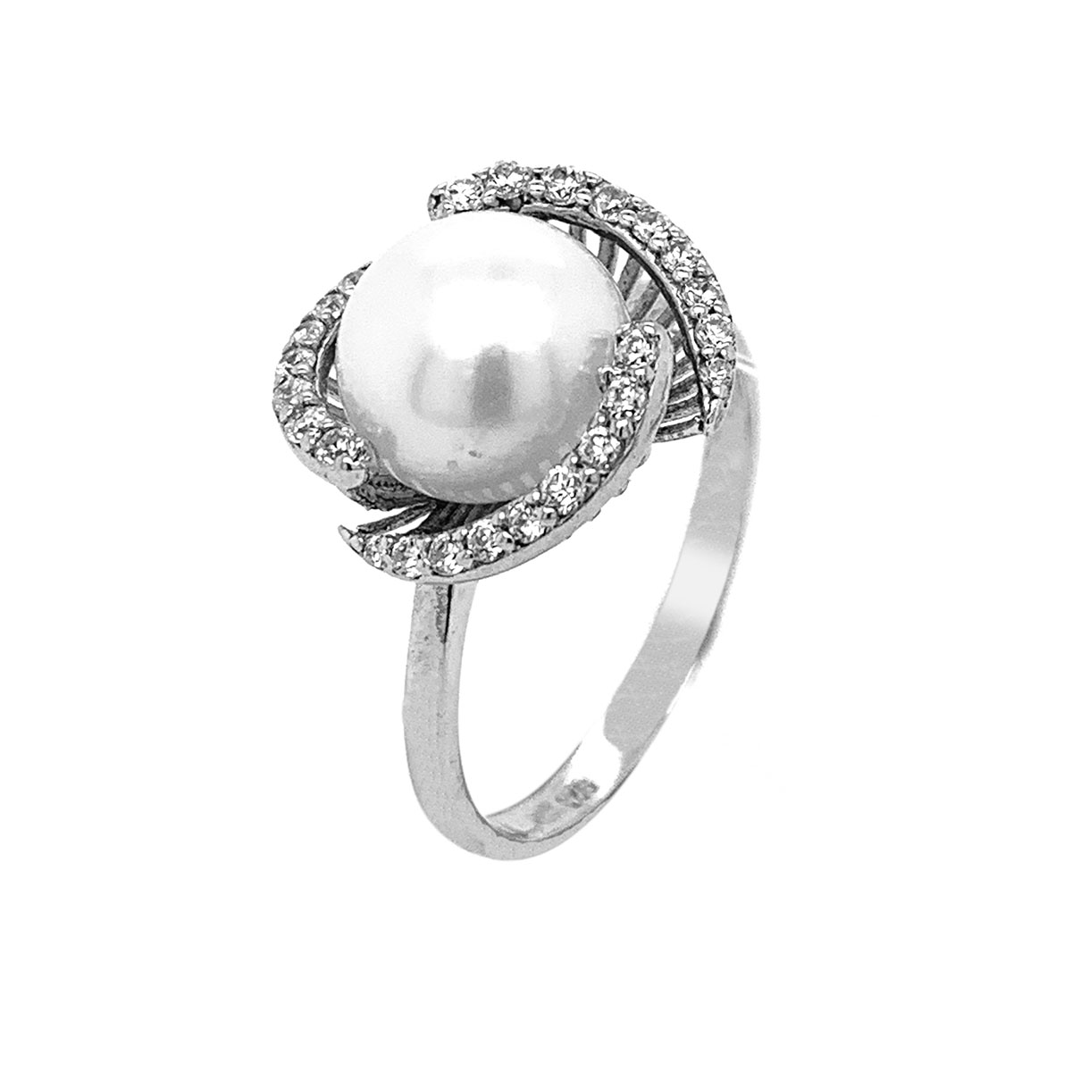 Кольцо из серебра с культ.жемчугом и фианитами родированное