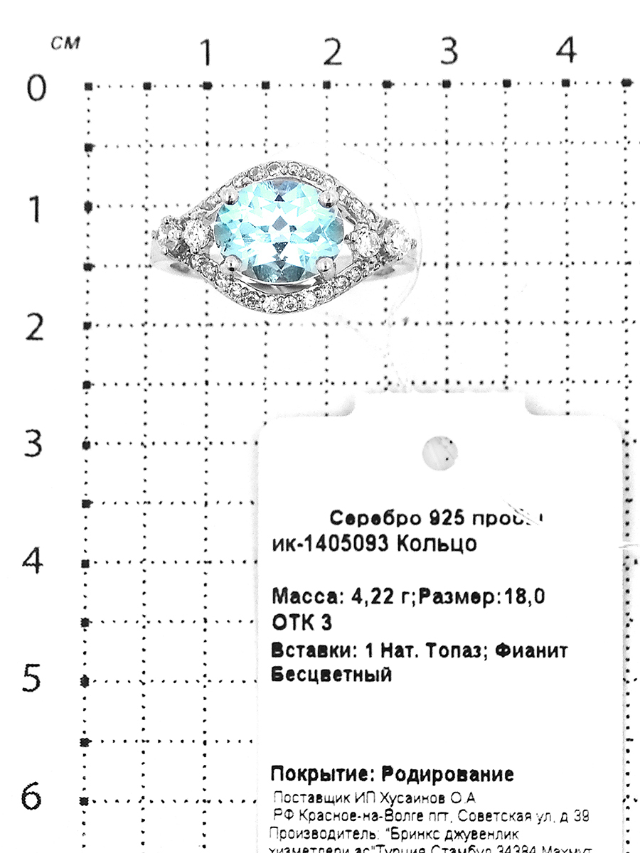 Кольцо из серебра с нат. топазом и фианитами родированное ик-1405093