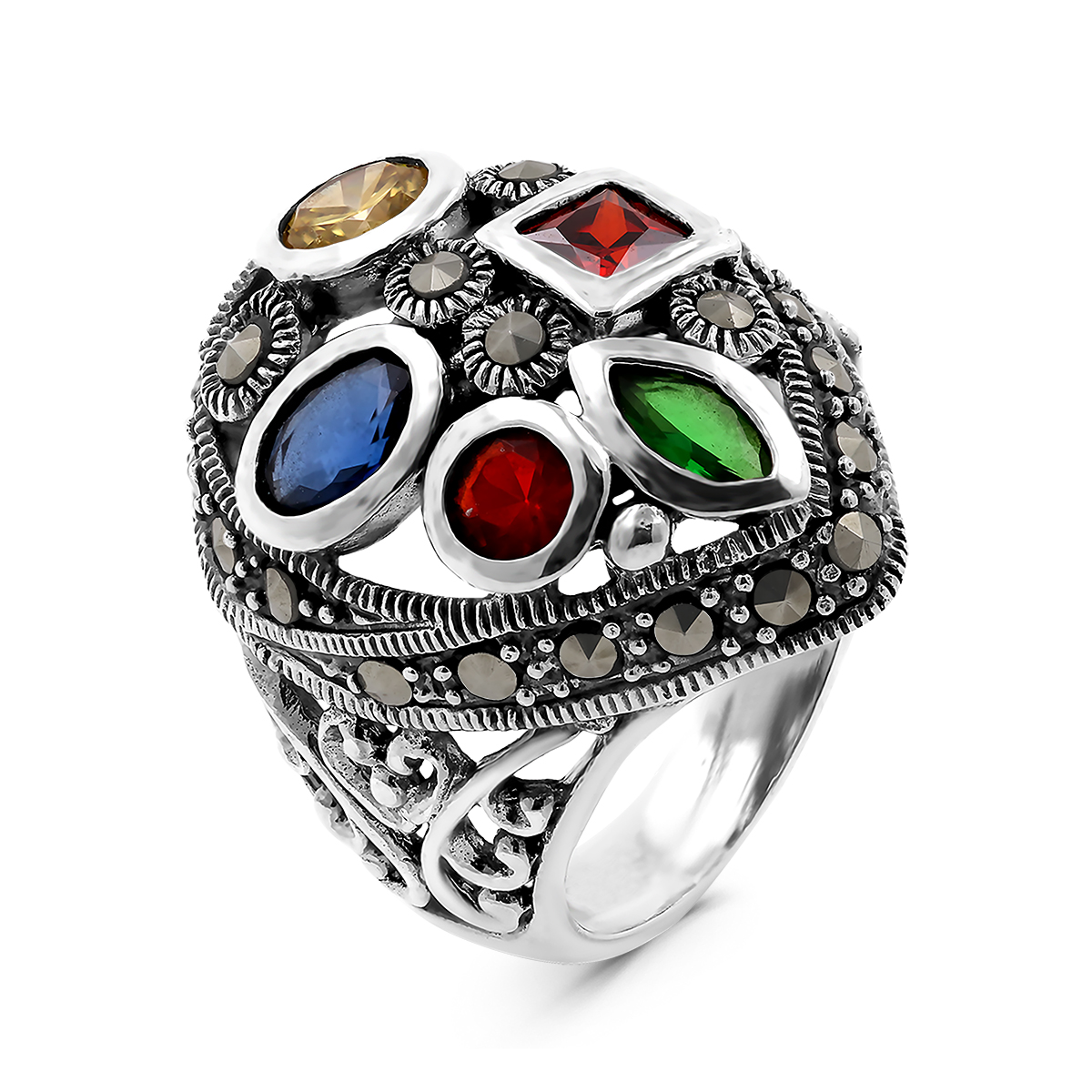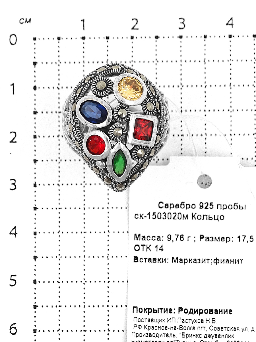 Кольцо из серебра с пл.кварцем цв. гранат,сапфир,хризолит, цитрин и марказитами родированное