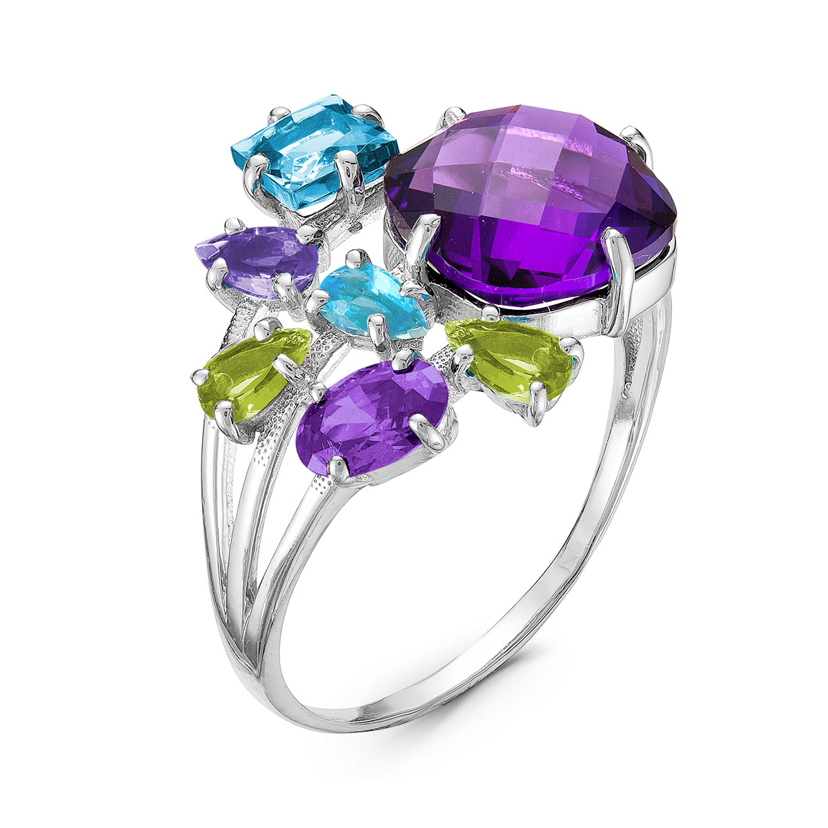 Кольцо из серебра с пл.кварцем цв.аметист,хризолит,топаз родированное