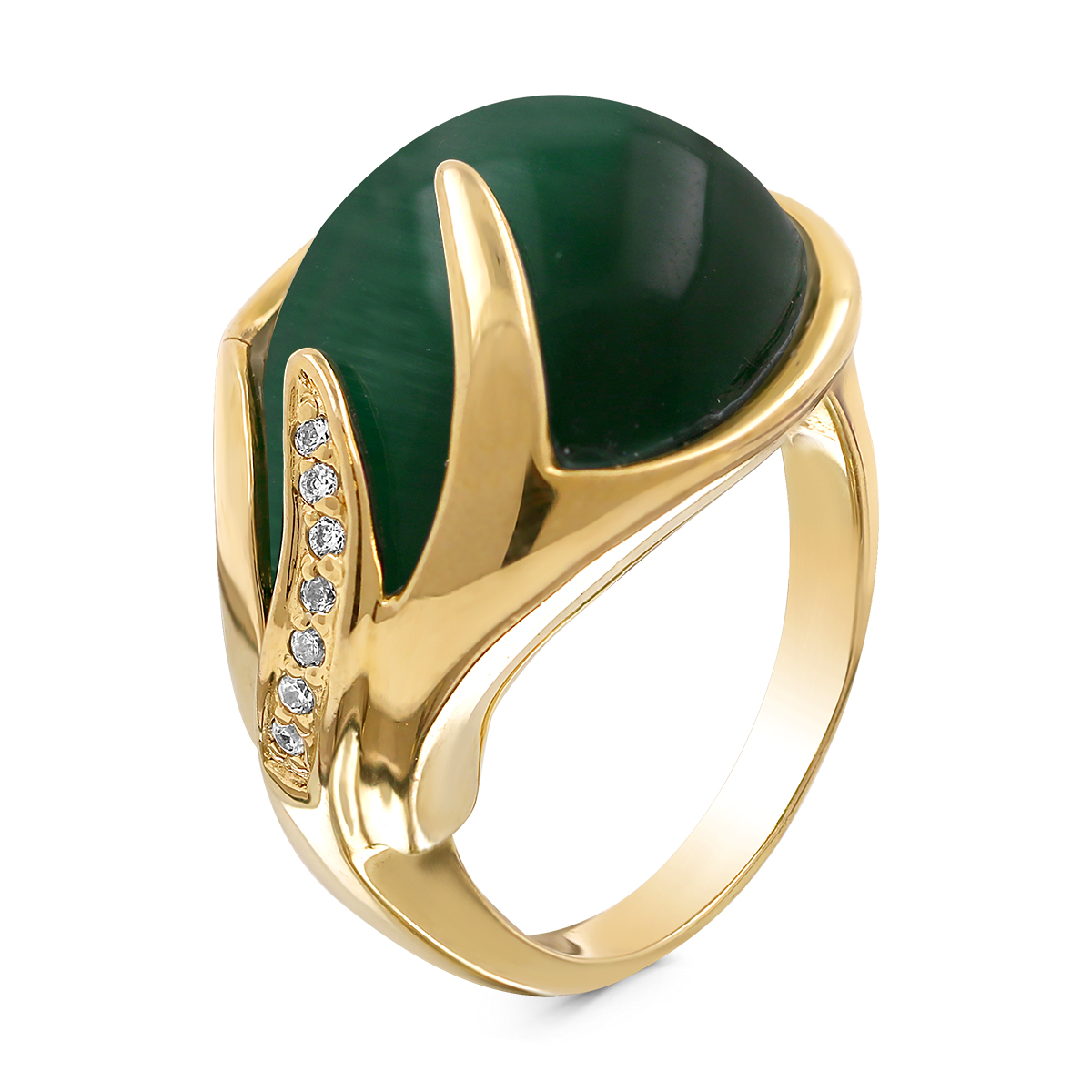 Кольцо из золочёного серебра с кварцем кошачий глаз и фианитами