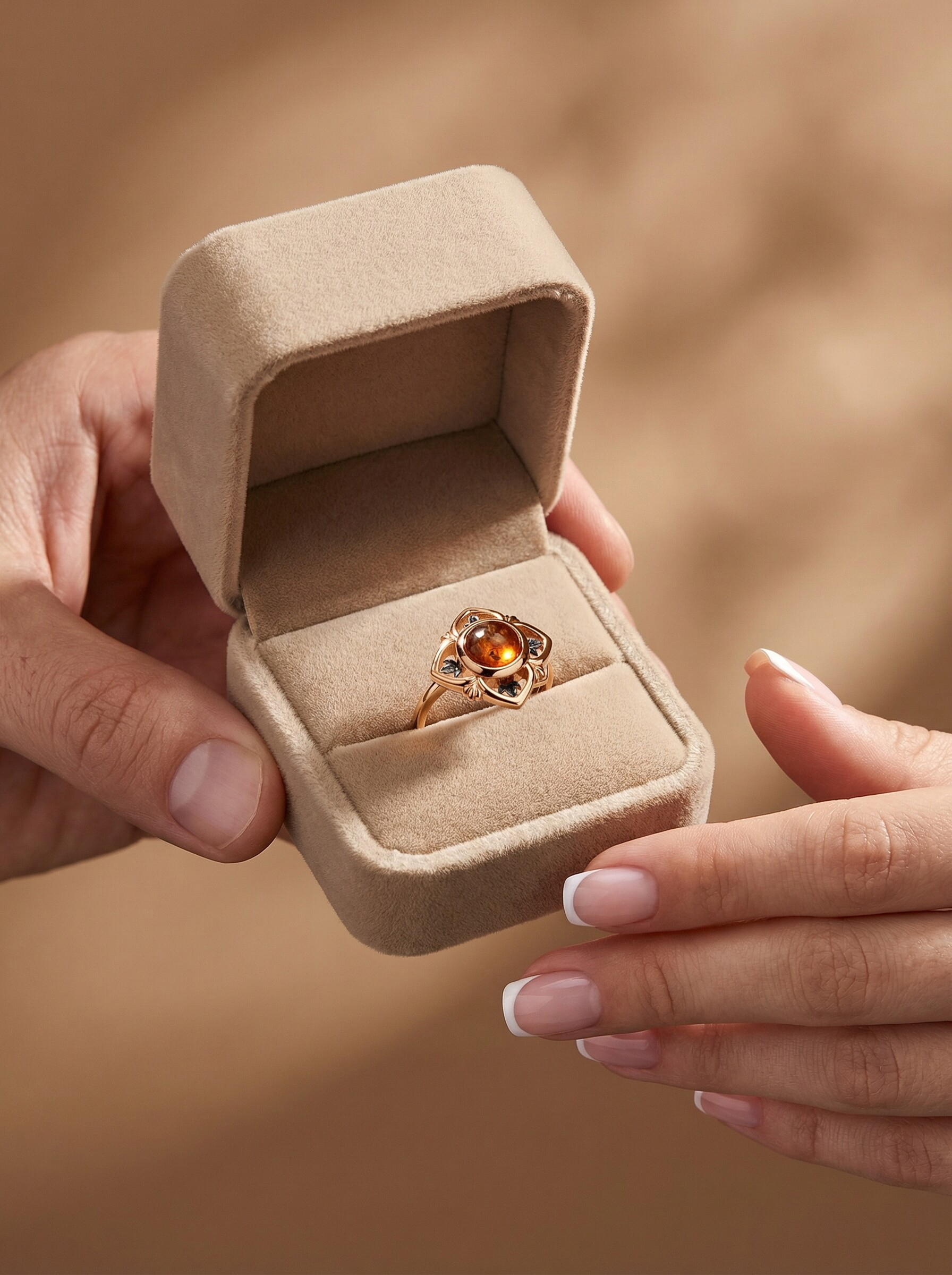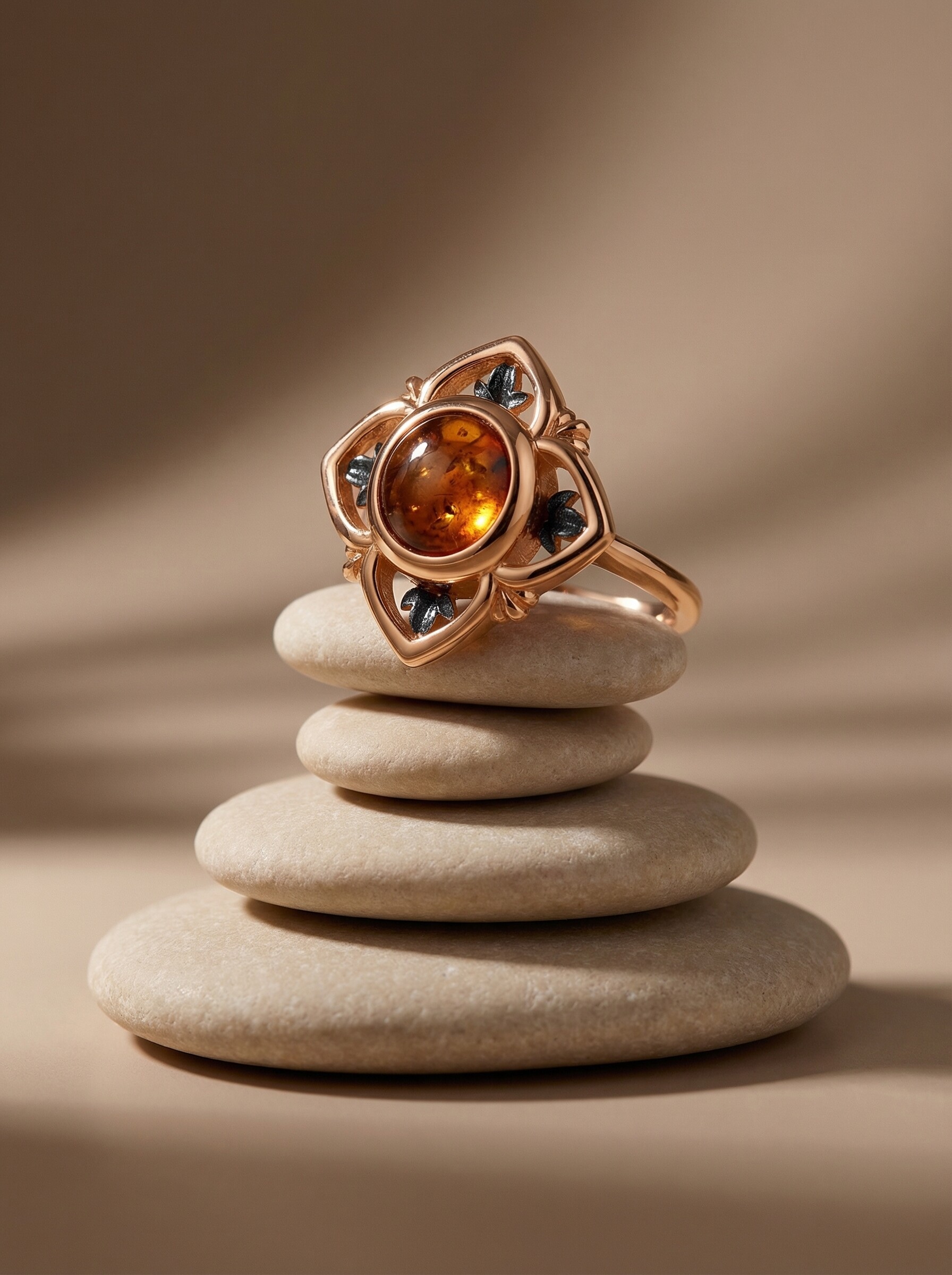 Кольцо женское из золочёного серебра с янтарём и родированием