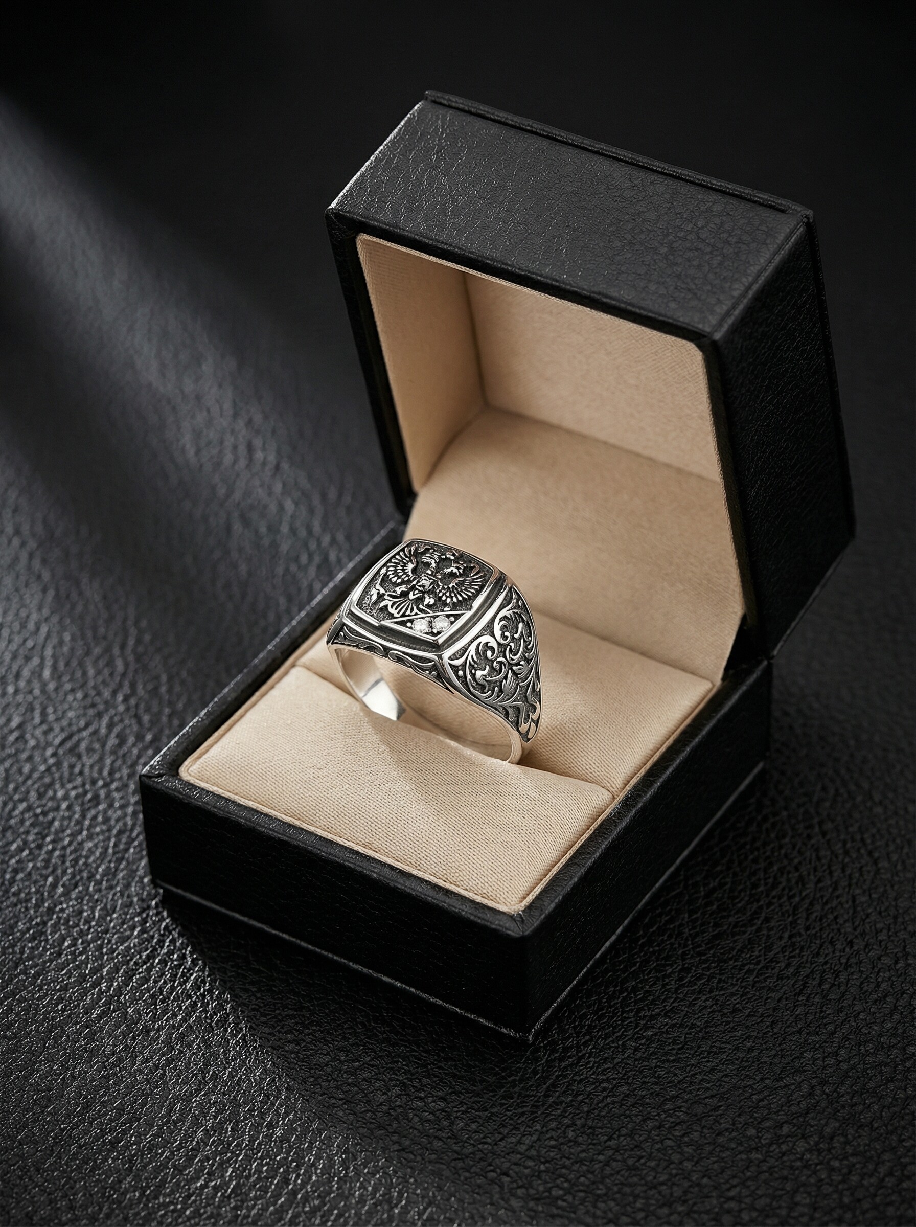 Печатка мужская из чернёного серебра с фианитами - Герб