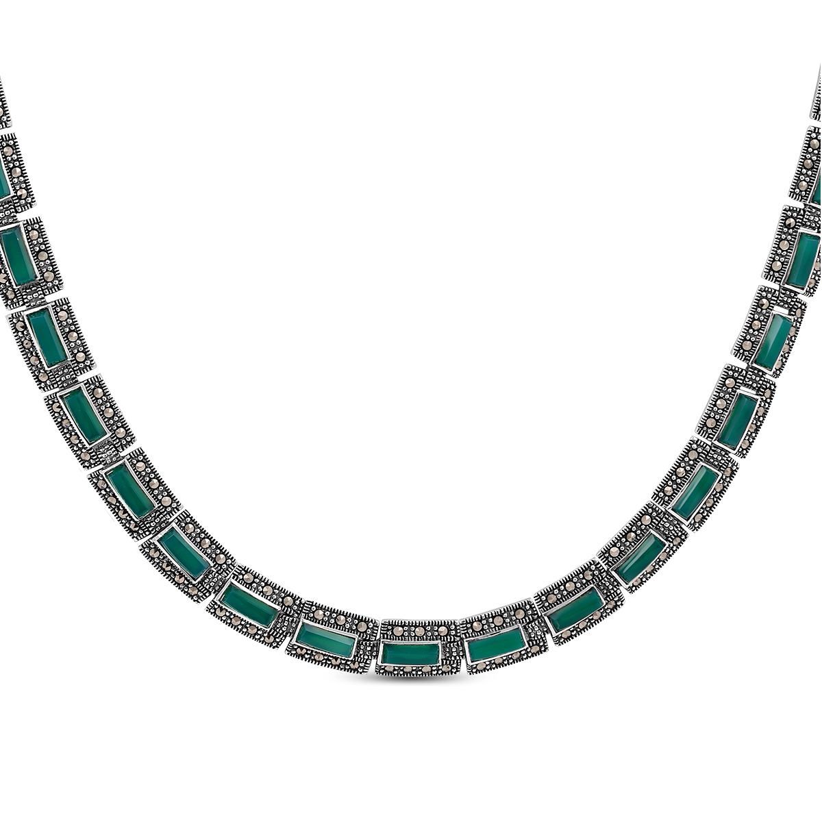 Колье из чернёного серебра с нат.зеленым агатом и марказитами