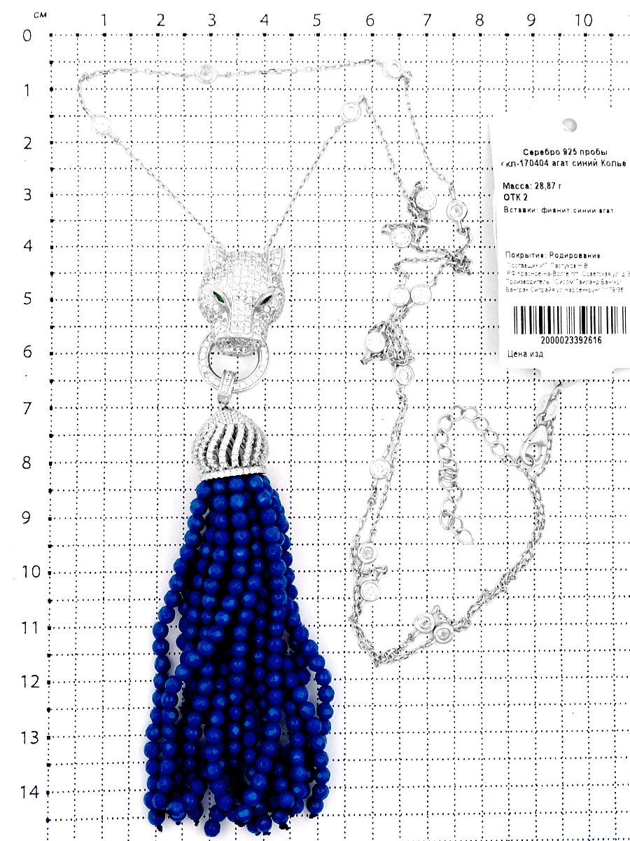 Колье из родированного серебра с синим агатом и фианитами - 40 см (+5)