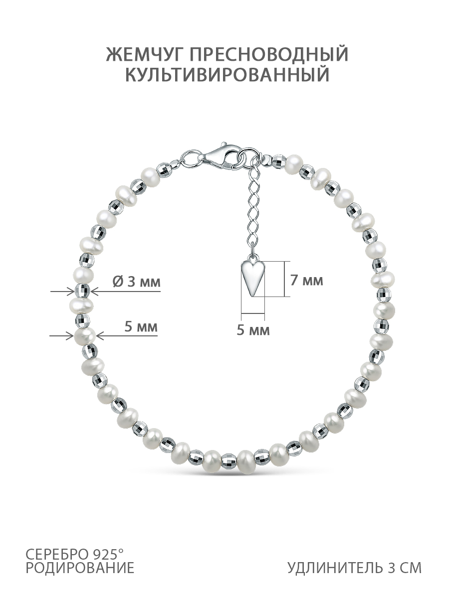 Браслет из серебра с пресноводным культивированным жемчугом родированный - 19 см