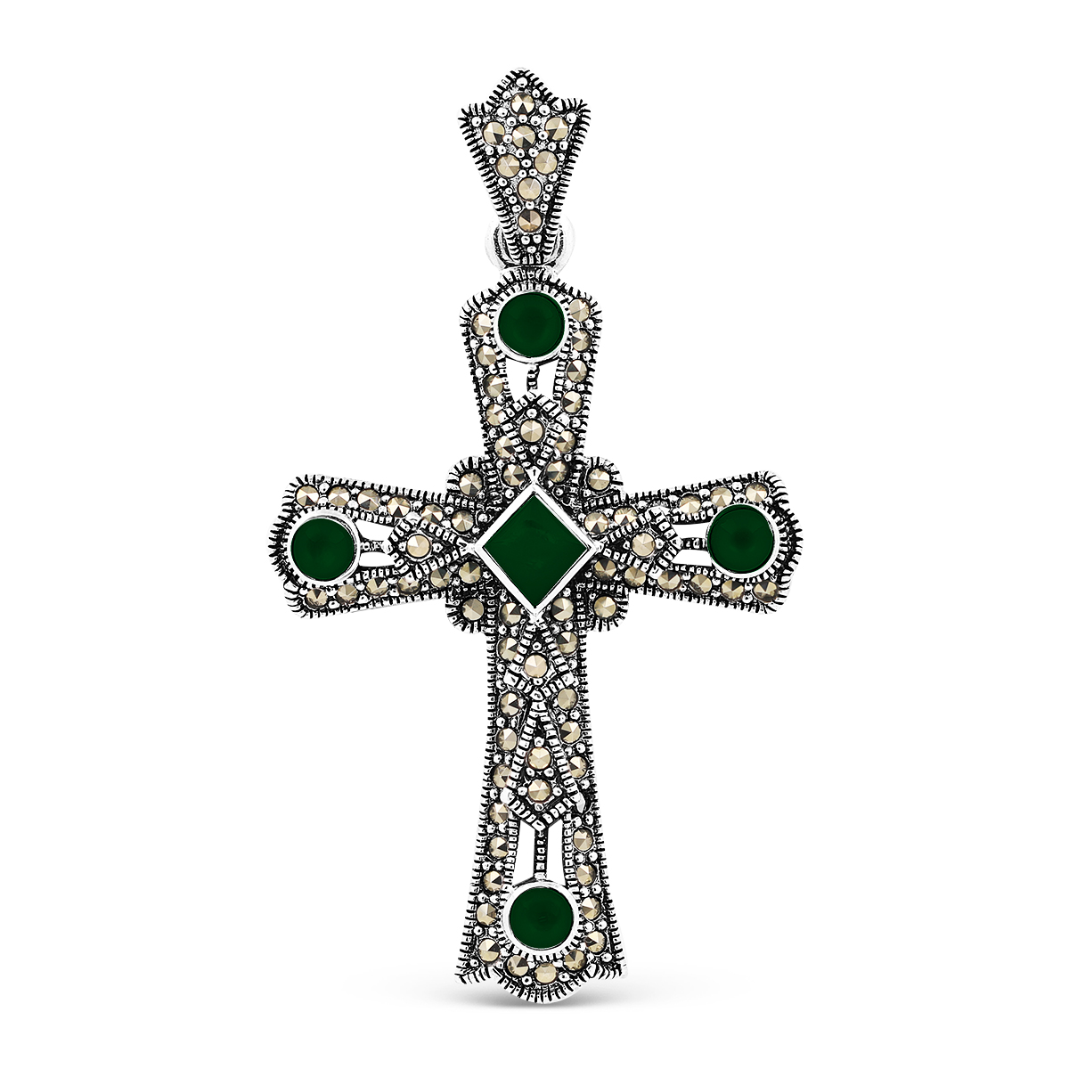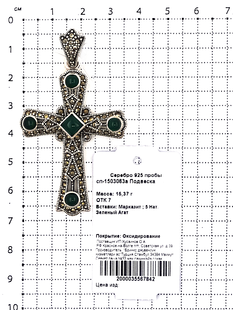 Подвеска из чернёного серебра с нат. зеленым агатом и марказитами сп-1503063а