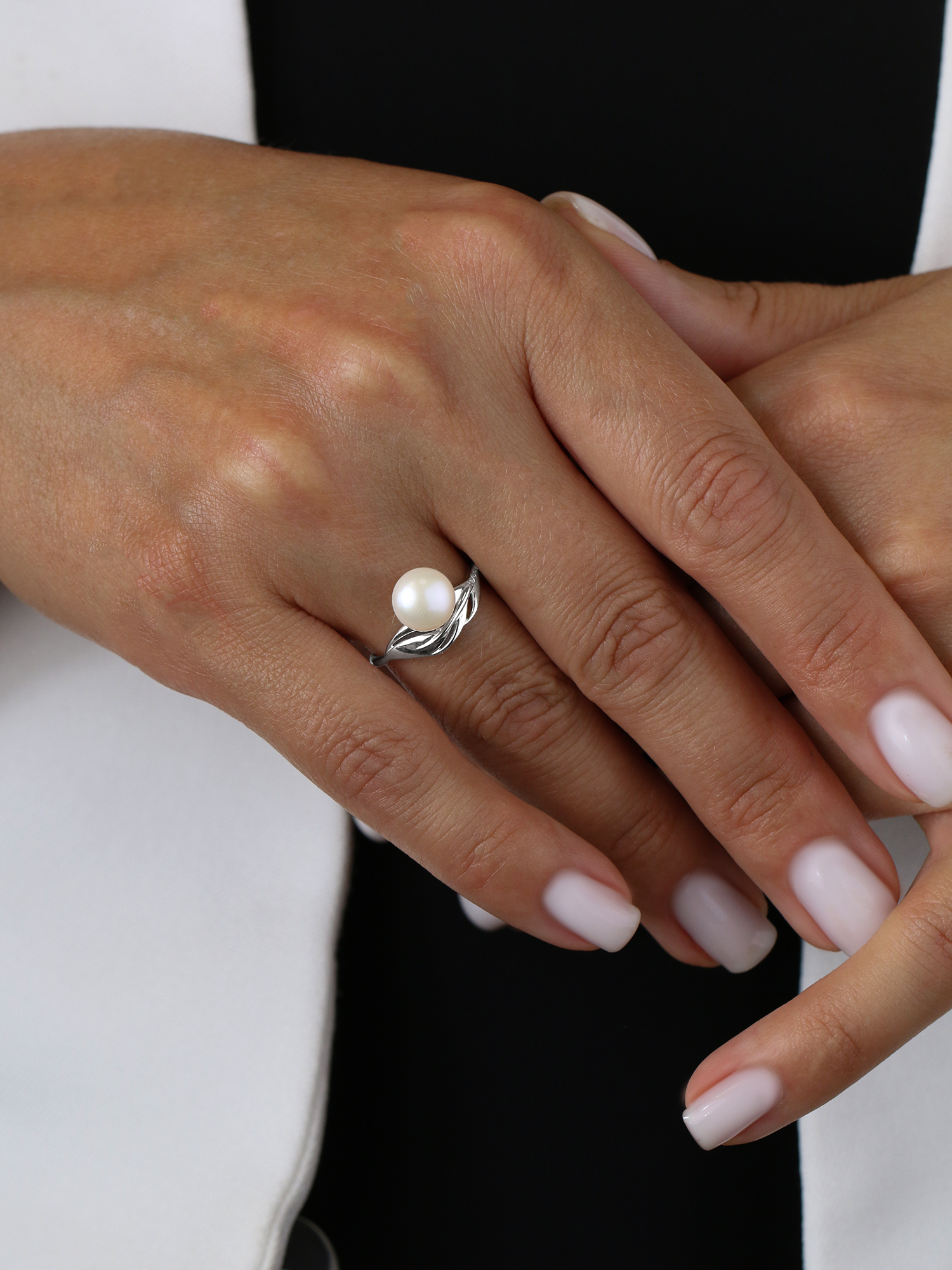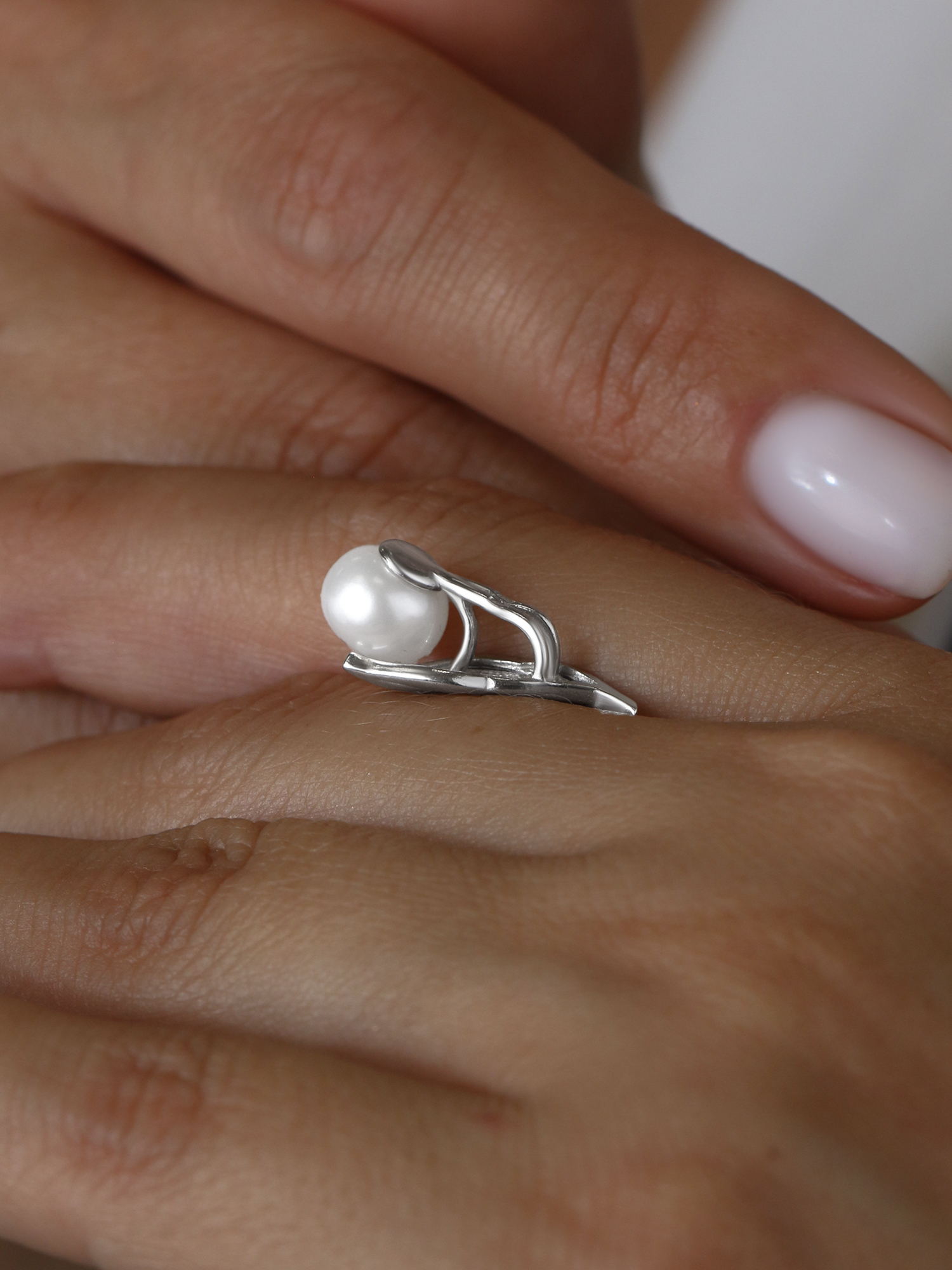 Кольцо из серебра с культивированным жемчугом и фианитами родированное