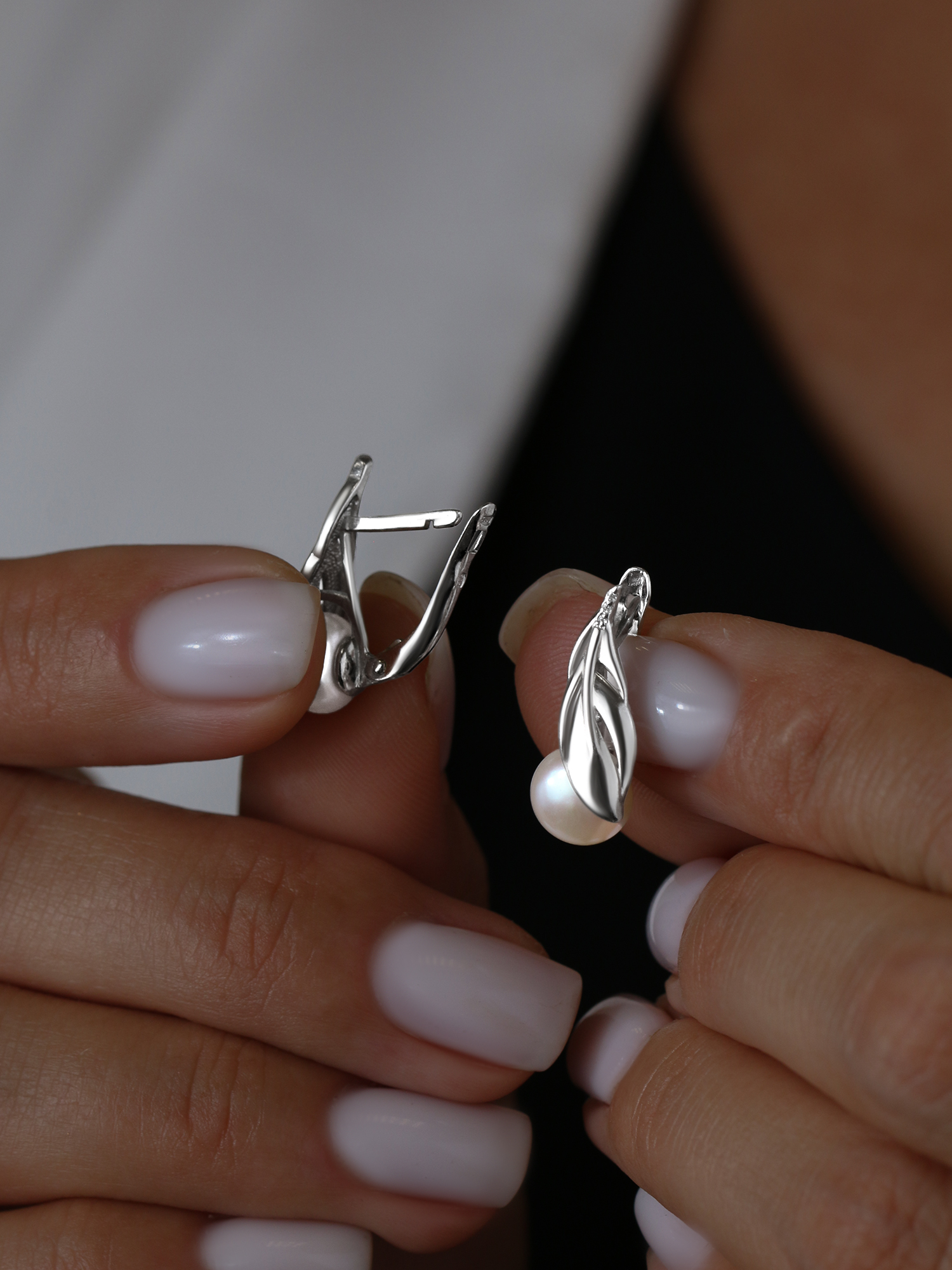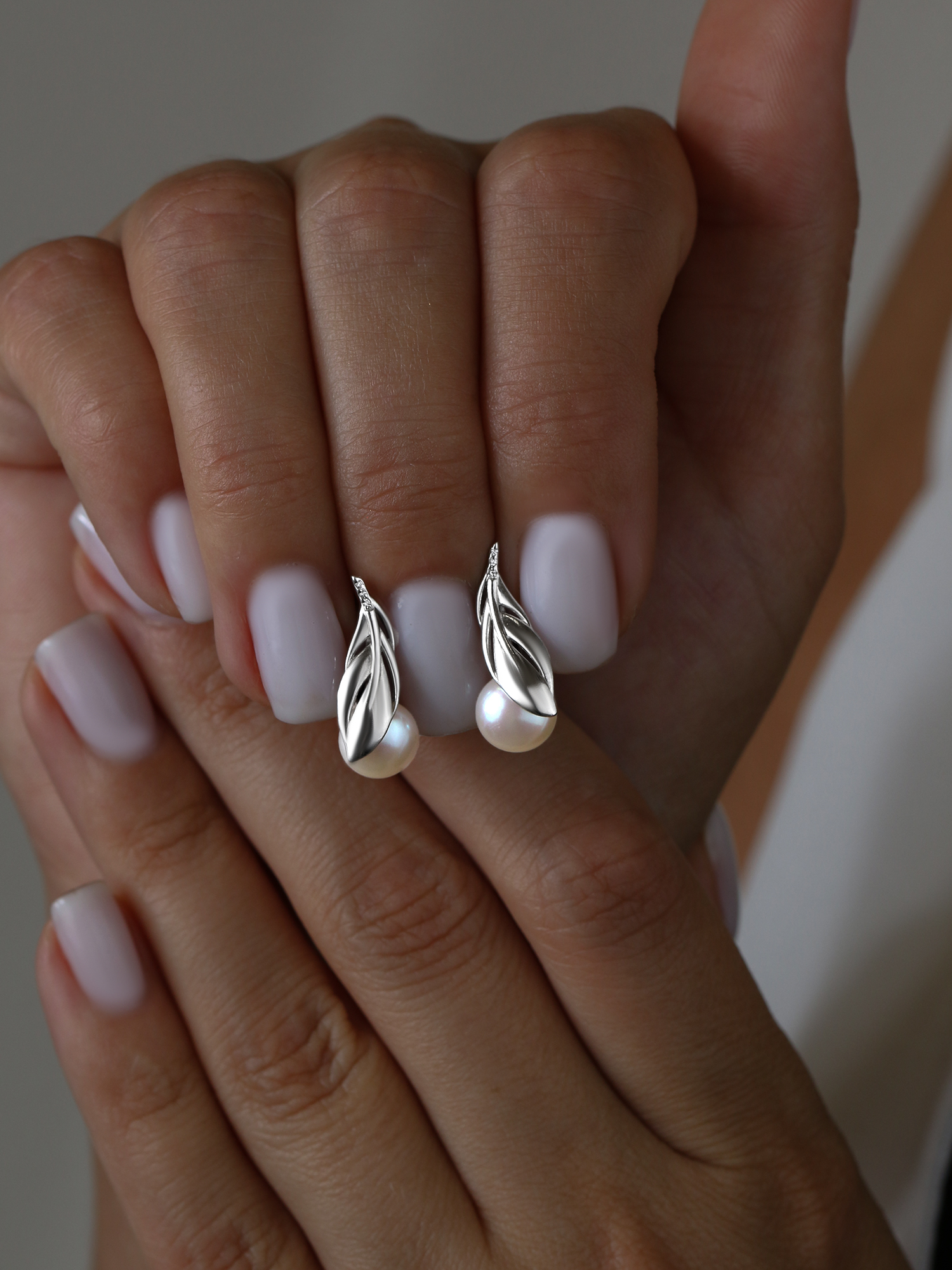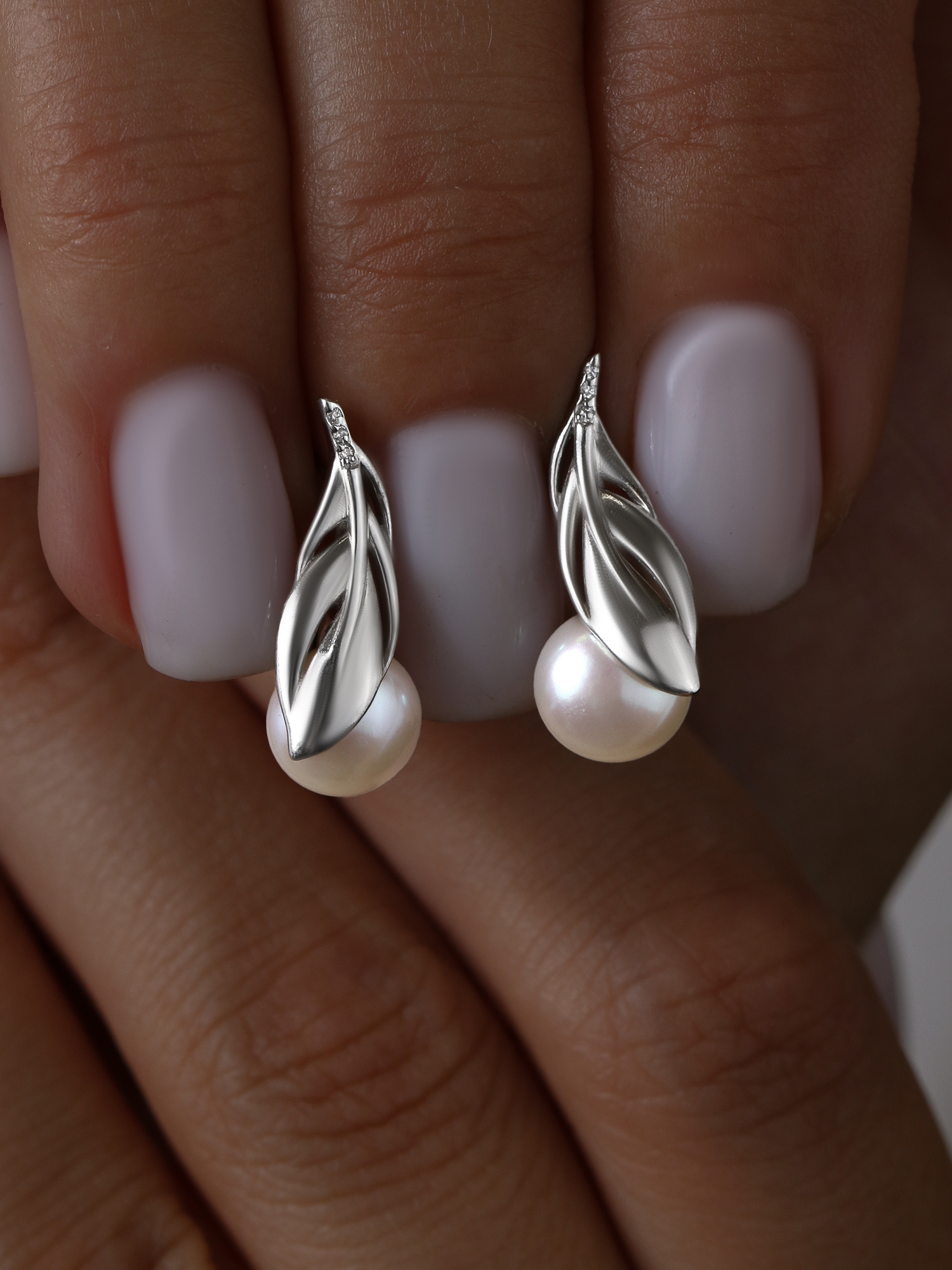 Серьги из серебра с культивированным жемчугом и фианитами родированные