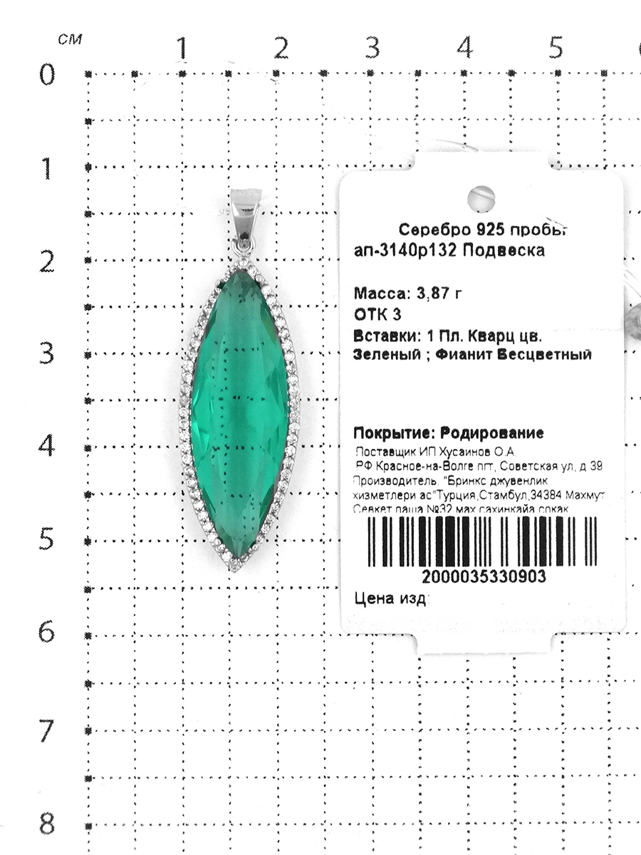 Подвеска из серебра с пл. зеленым кварцем и фианитами родированная ап-3140р132