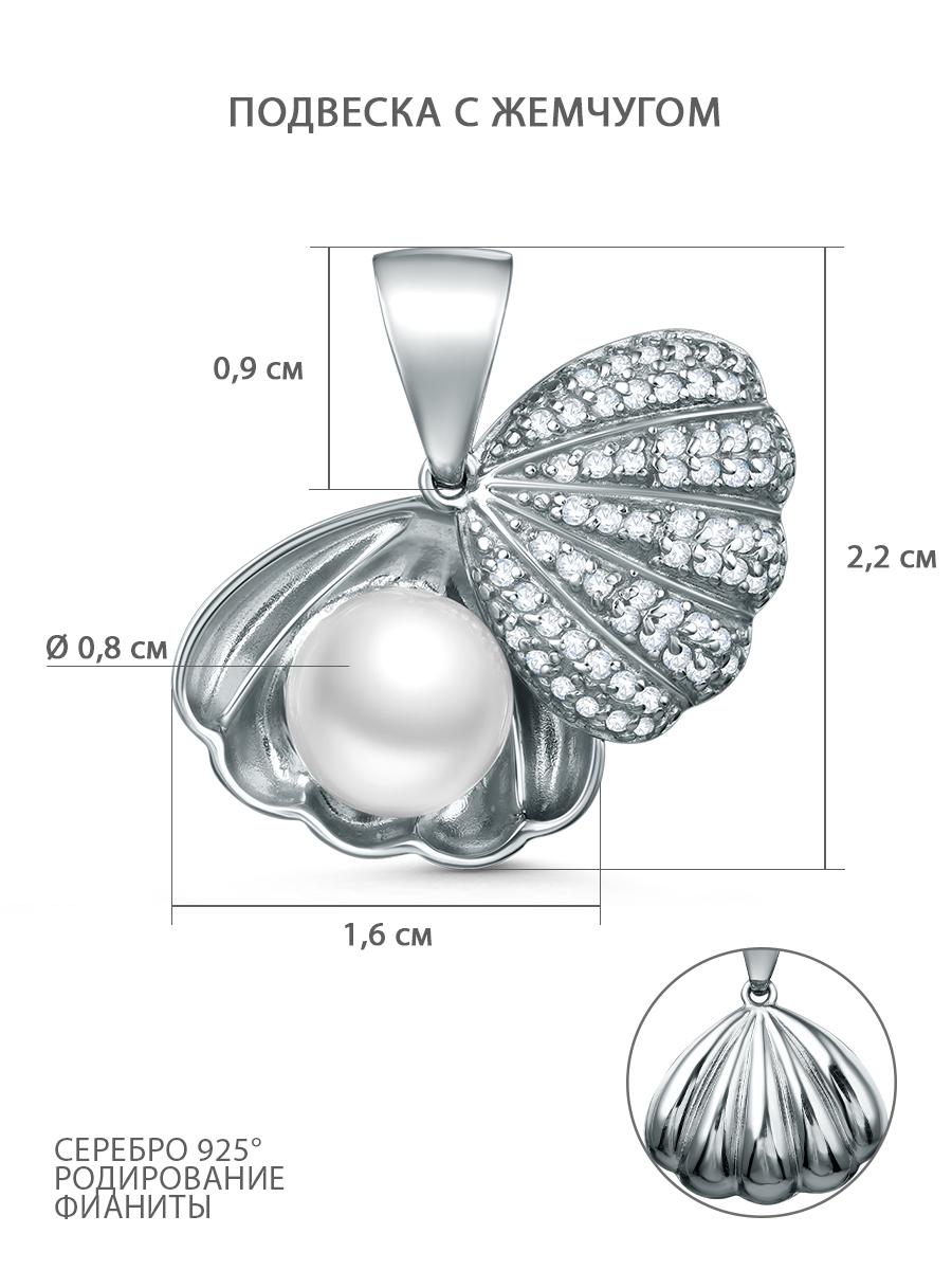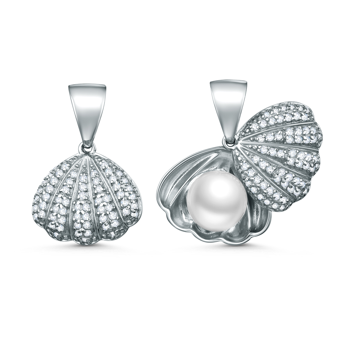 Подвеска из серебра с жемчугом и фианитами родированная - Ракушка