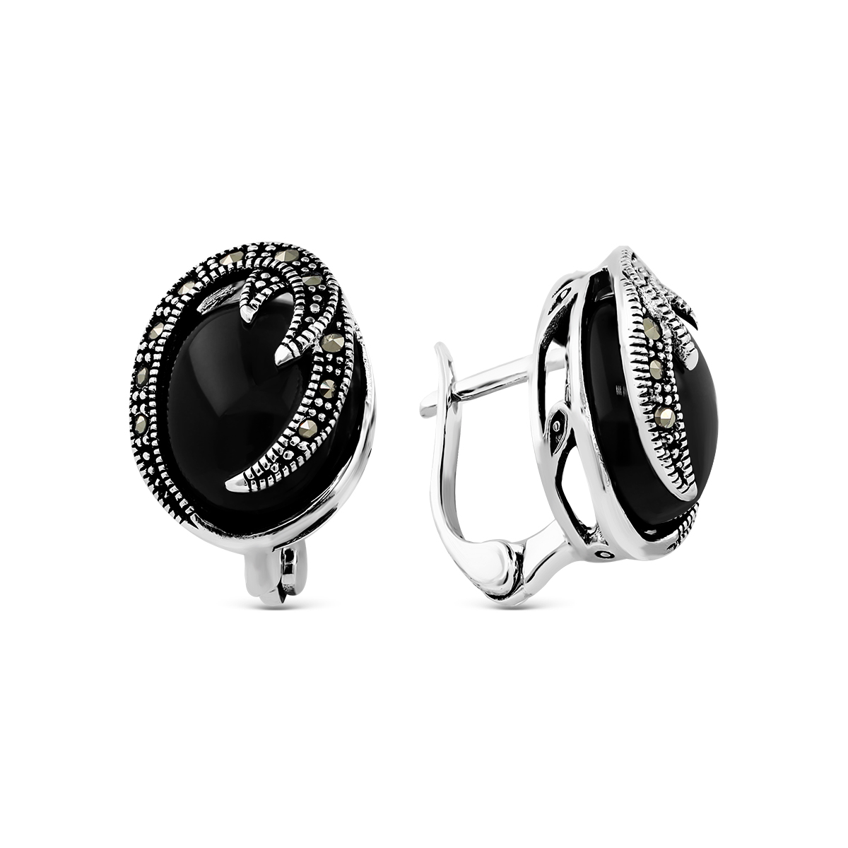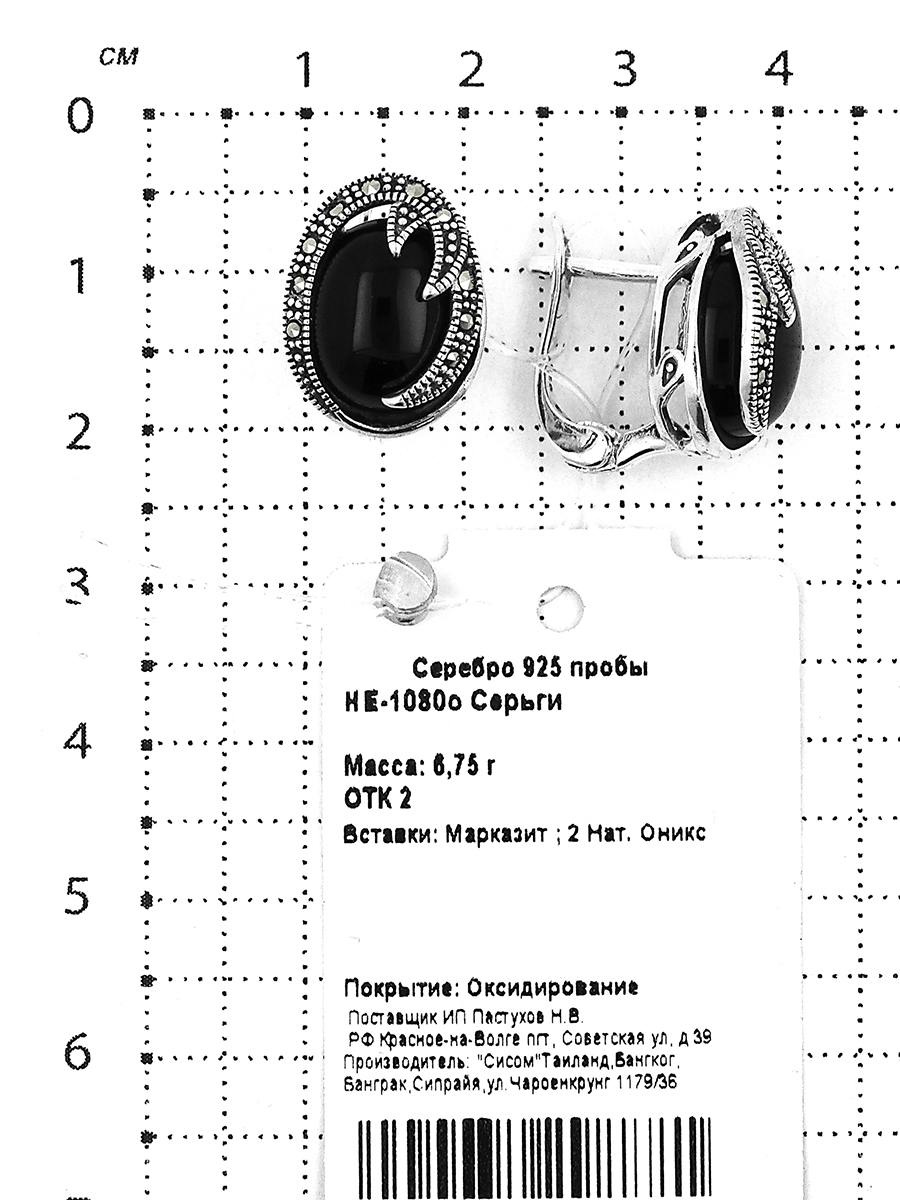 Серьги из чернёного серебра с нат. ониксом и марказитами HE-1080о