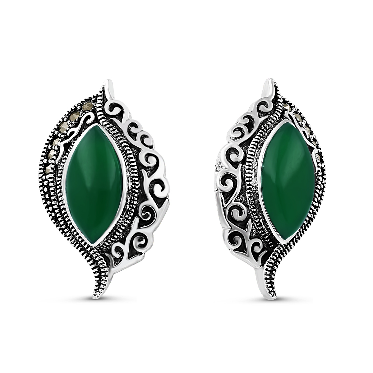 Серьги из чернёного серебра с нат. зеленым агатом и марказитами HE-1313а