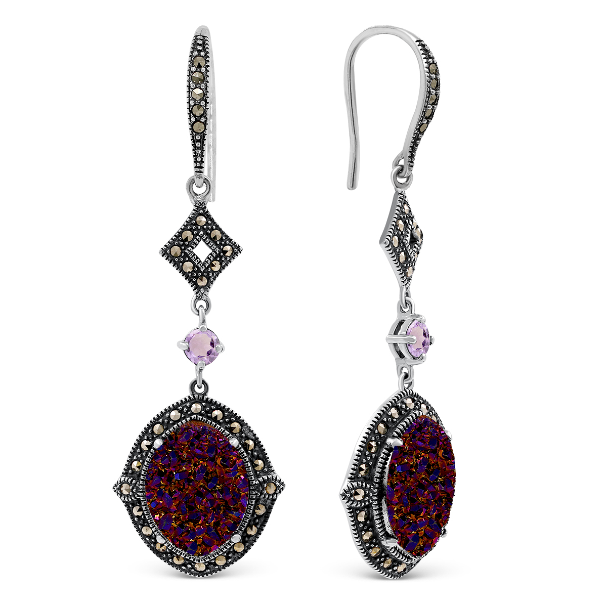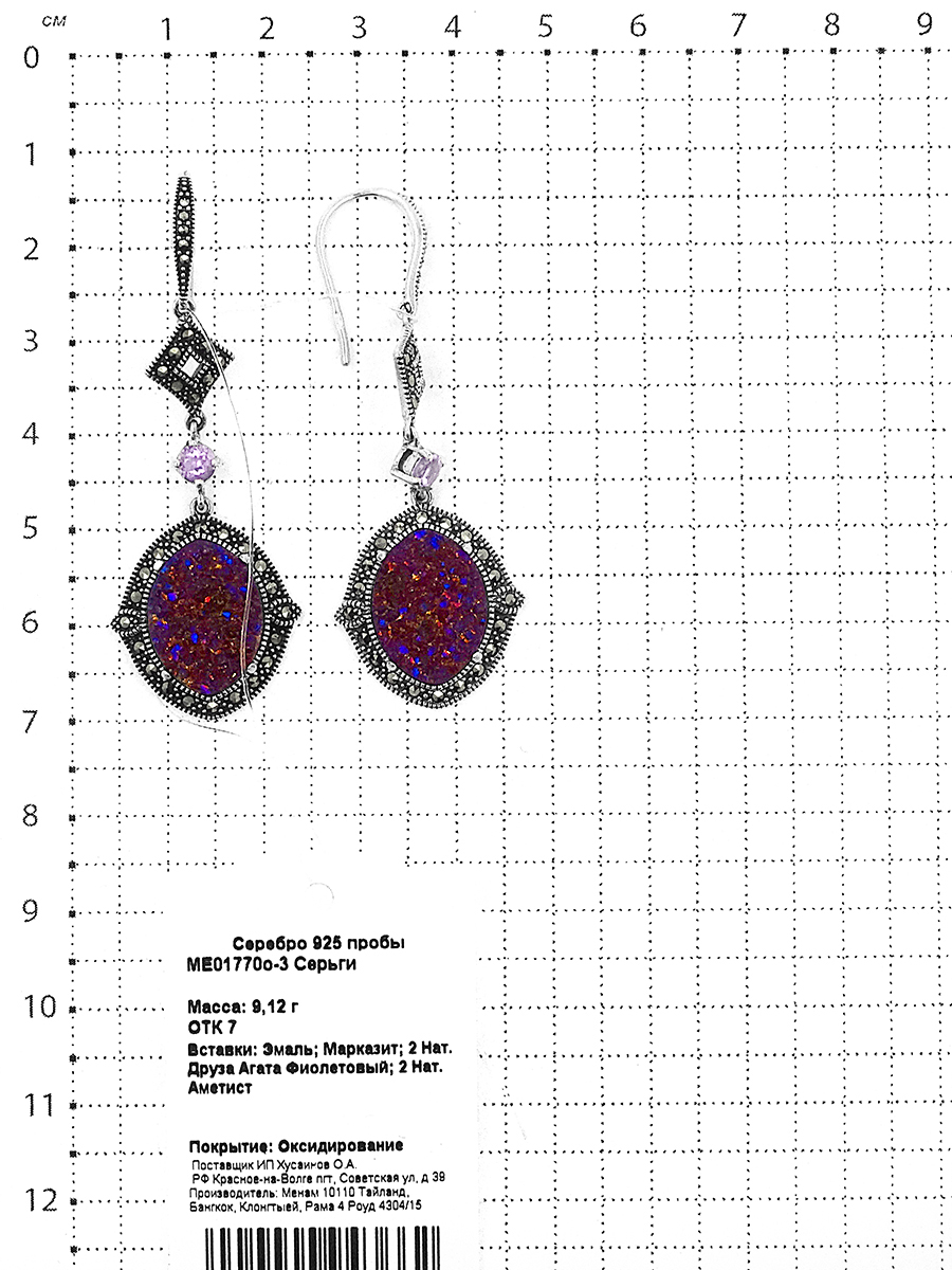 Серьги из чернёного серебра с нат.друзой агата цв.фиолетовый,нат.аметистом, эмалью и марказитами ME01770о-3