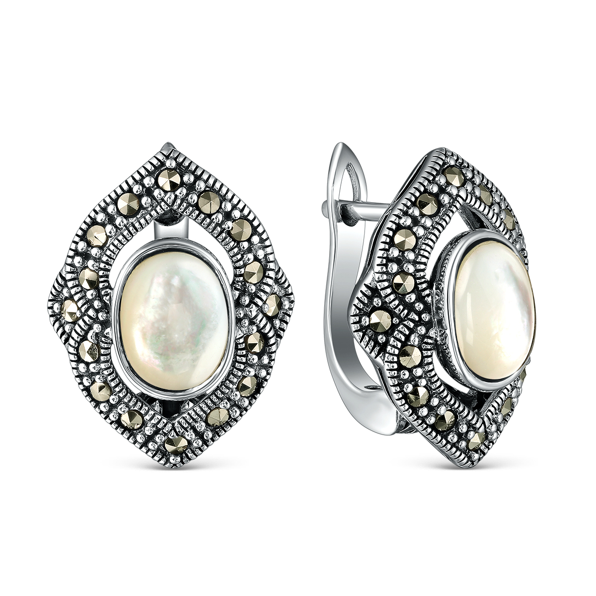 Серьги из чернёного серебра с перламутром и марказитами