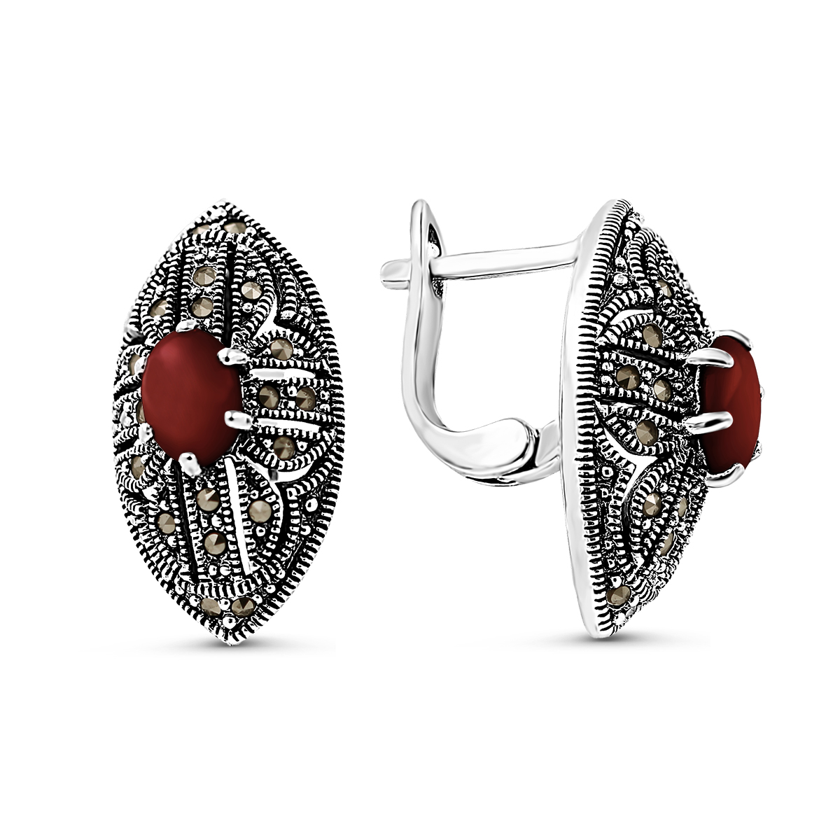 Серьги из чернёного серебра с рек. красным агатом и марказитами HE-515ка