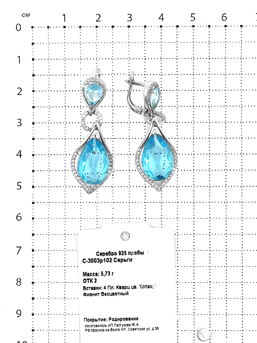 Серьги из серебра пл. кварцем цв. топаз и фианитами родированные С-3003р102