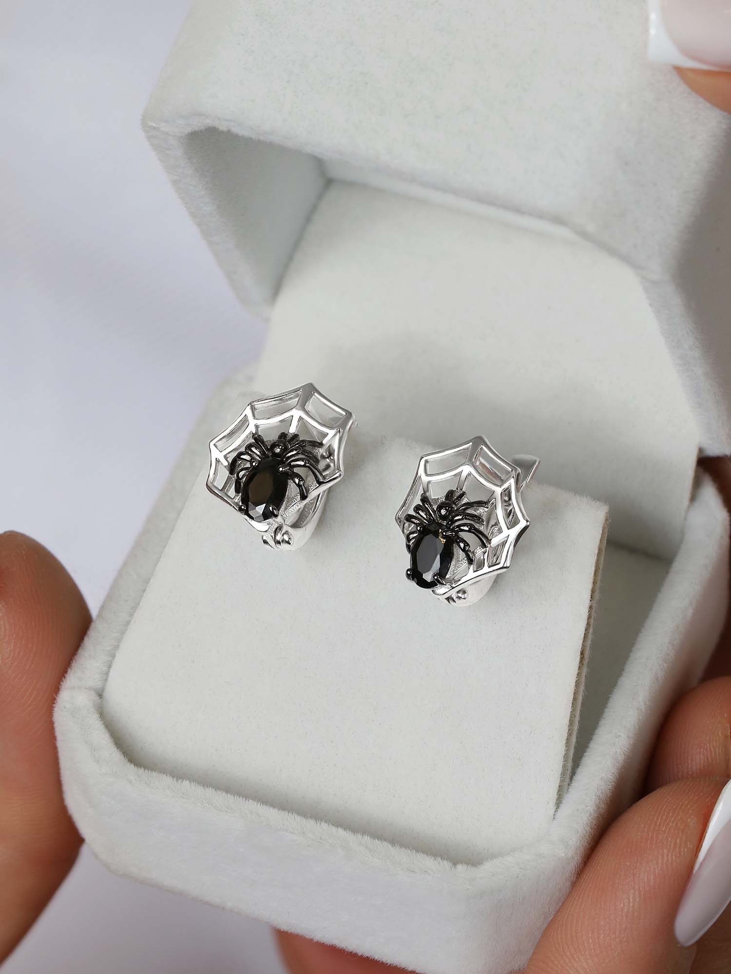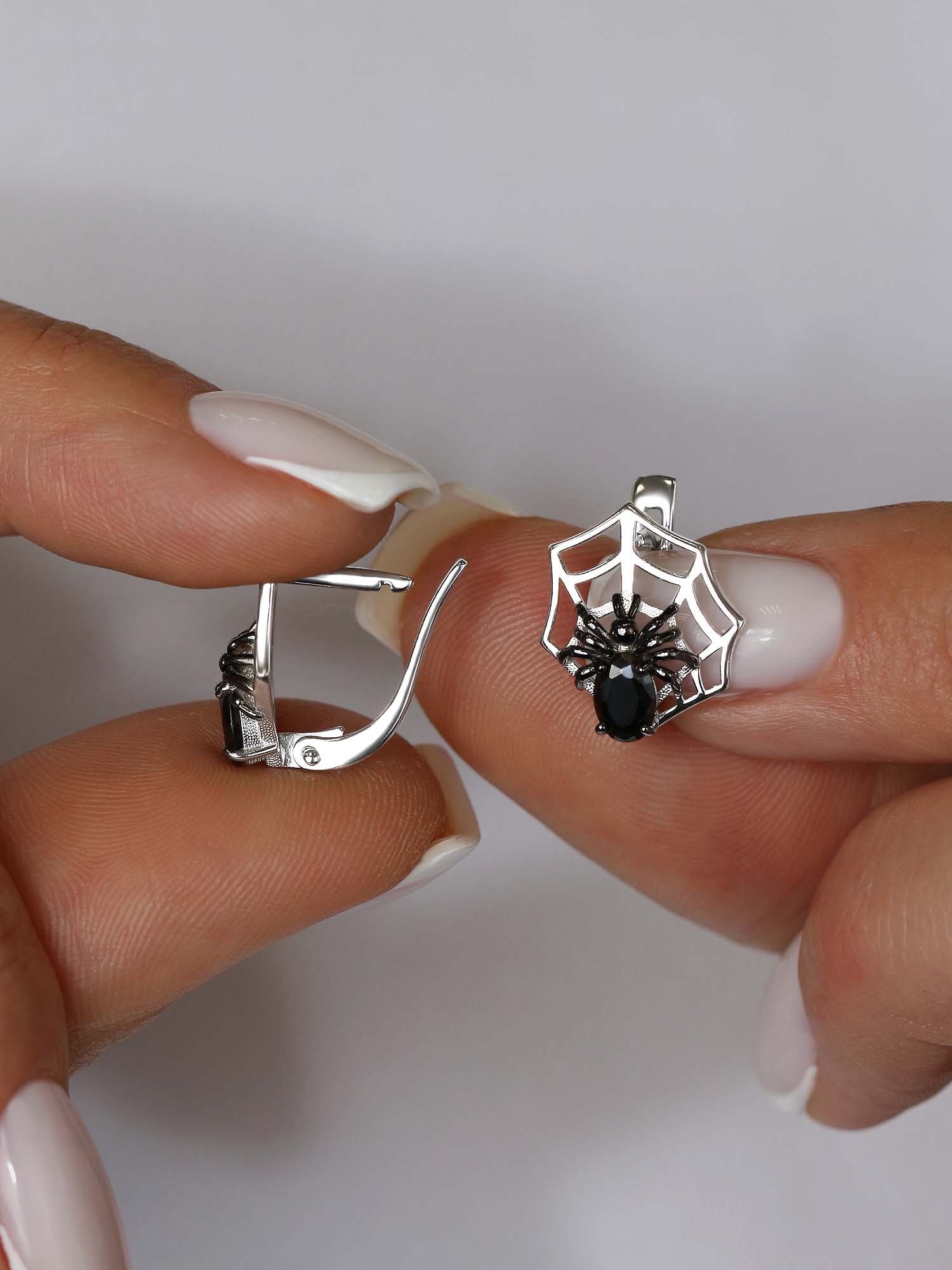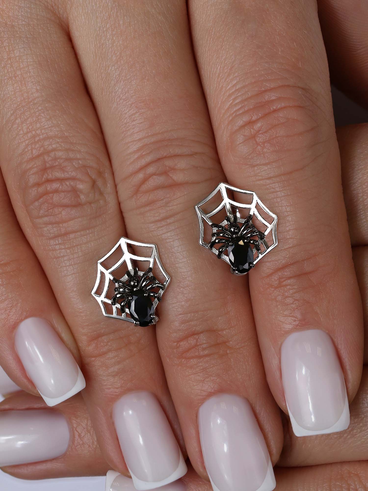Серьги из серебра с чёрными фианитами родированные - Пауки