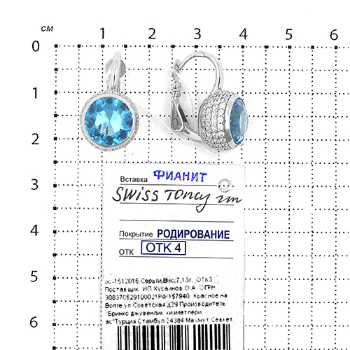 Серьги из серебра с гт. swiss топазом и фианитами родированные ос-1512015