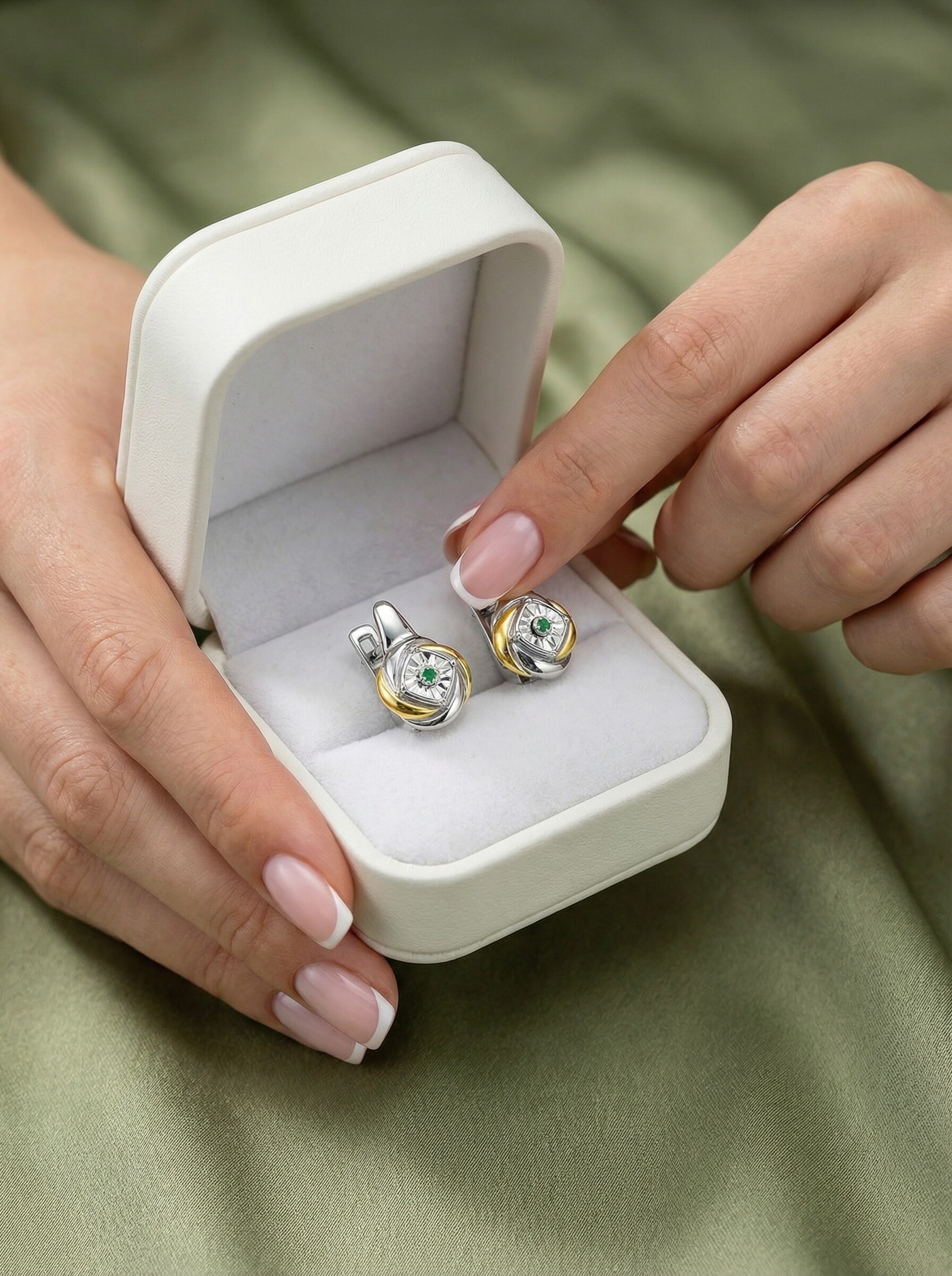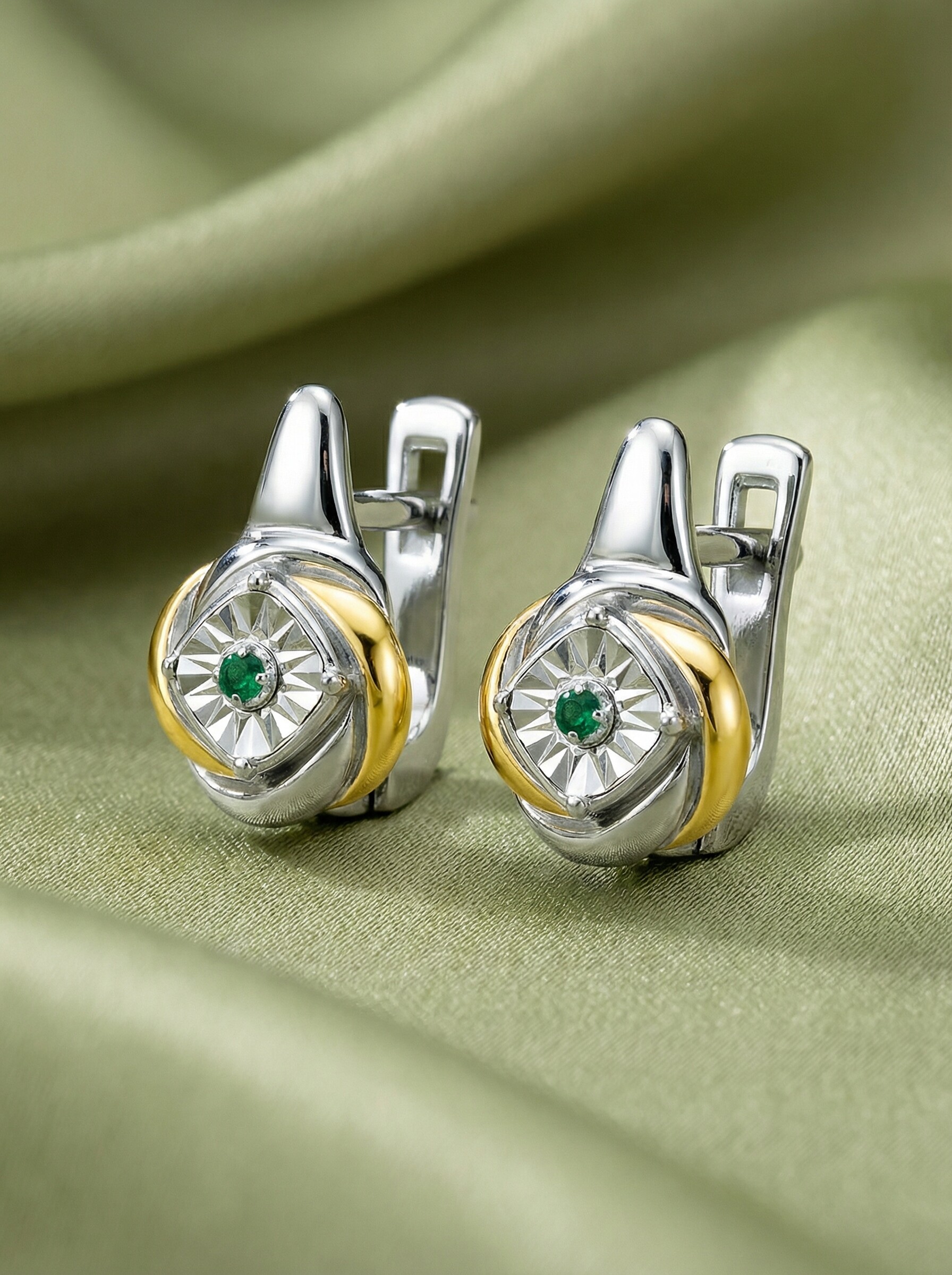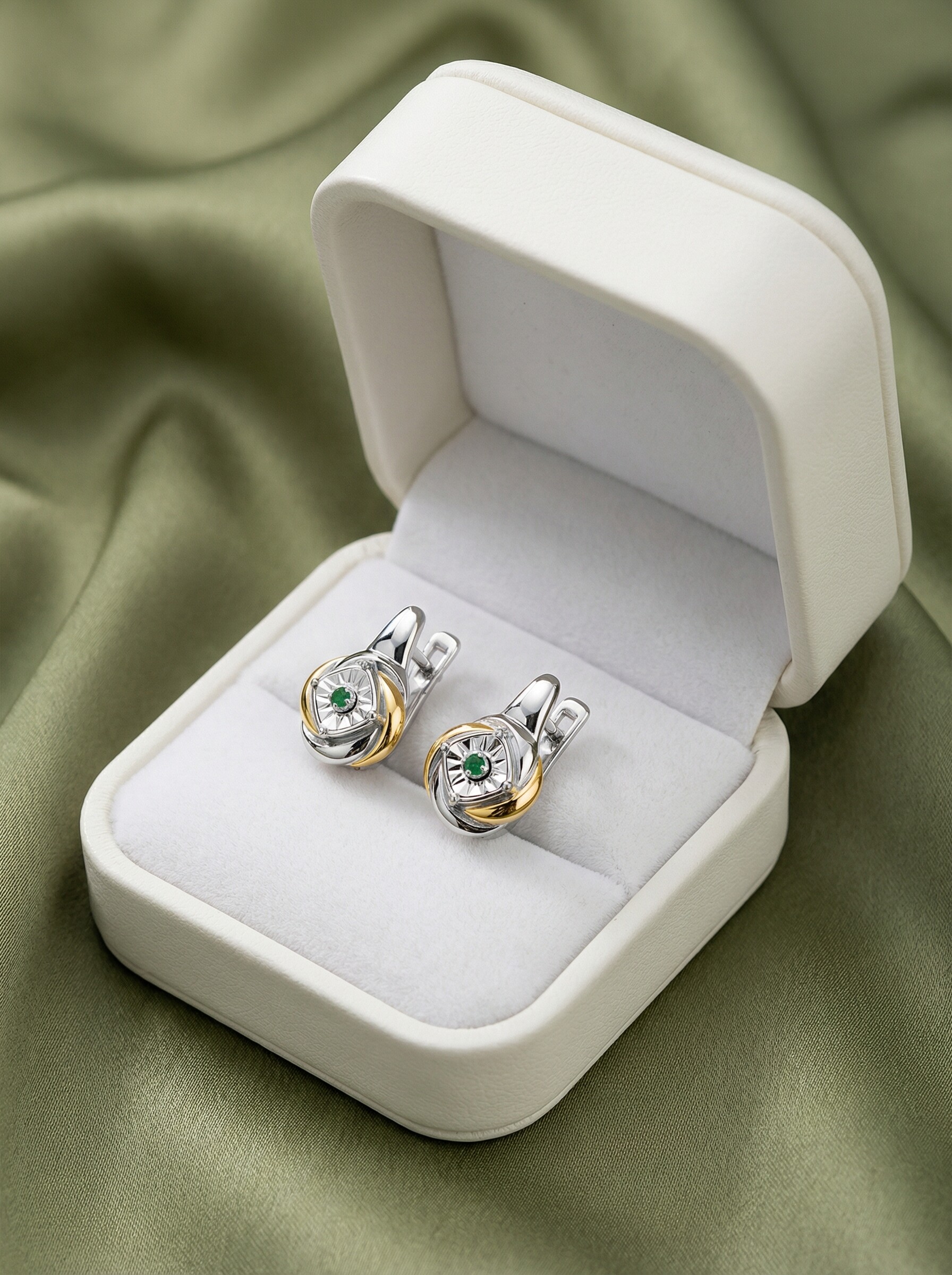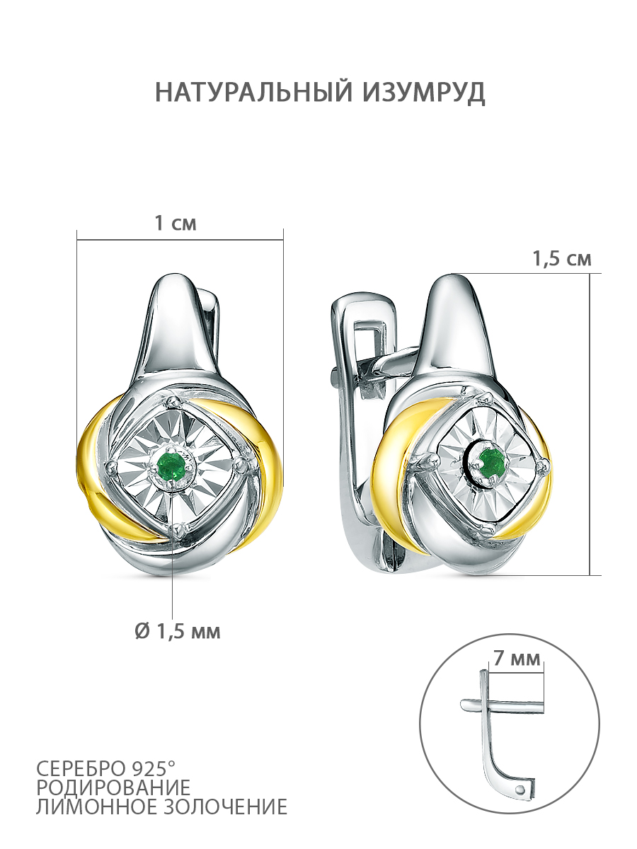 Серьги из серебра с изумрудом и золочением родированные