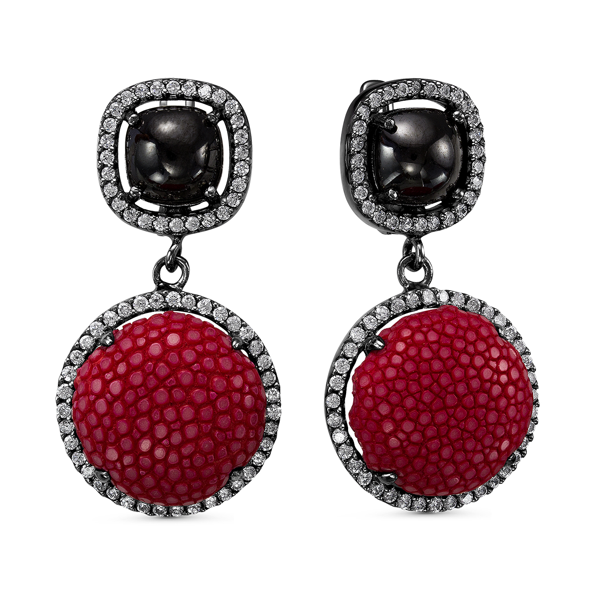 Серьги из серебра с кожей ската, ювелирным стеклом, кубическим цирконием и рутениевым покрытием se2234-E красная