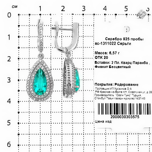 Серьги из серебра с кварцем параиба и фианитами родированные ас-1311022
