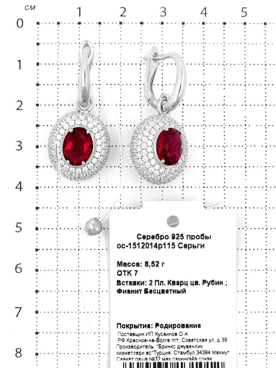 Серьги из серебра с кварцем рубин и фианитами родированные