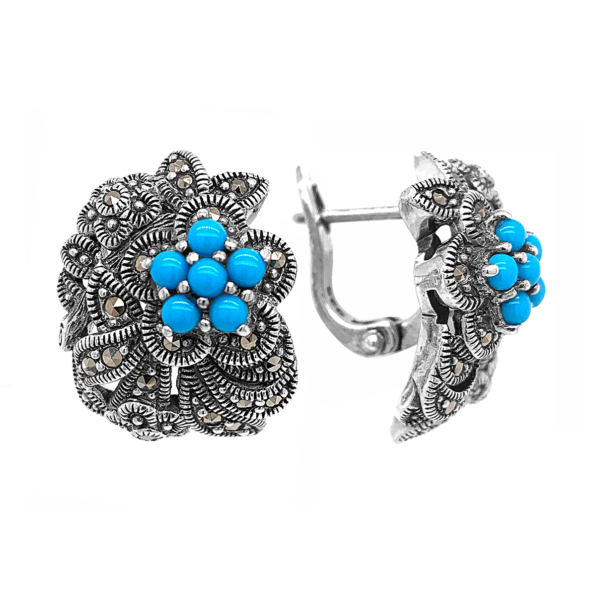 Серьги из серебра с марказитами и синт.бирюзой родированные