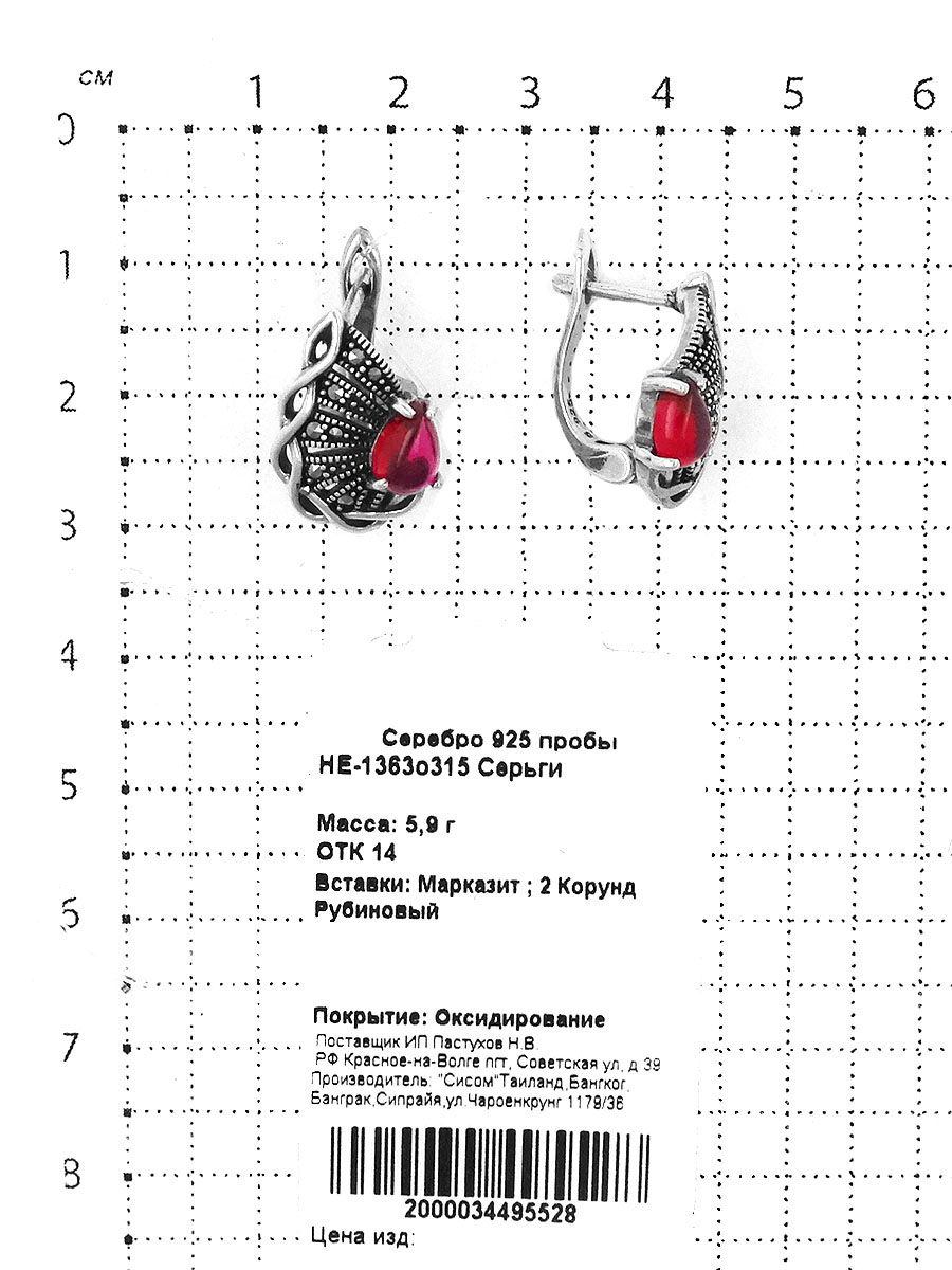 Серьги из серебра с марказитами, корунд рубиновым и чернением родированные HE-1363о315
