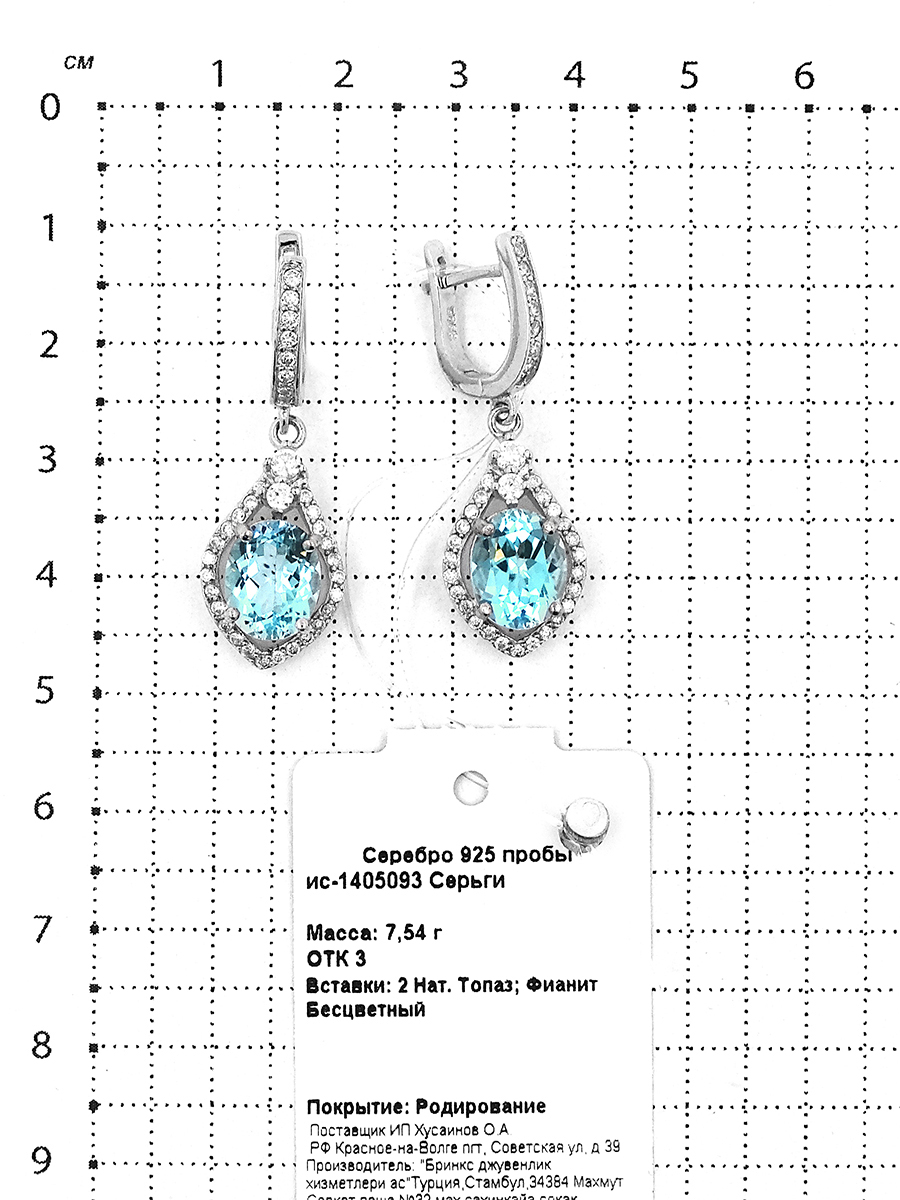 Серьги из серебра с нат. топазом и фианитами родированные ис-1405093