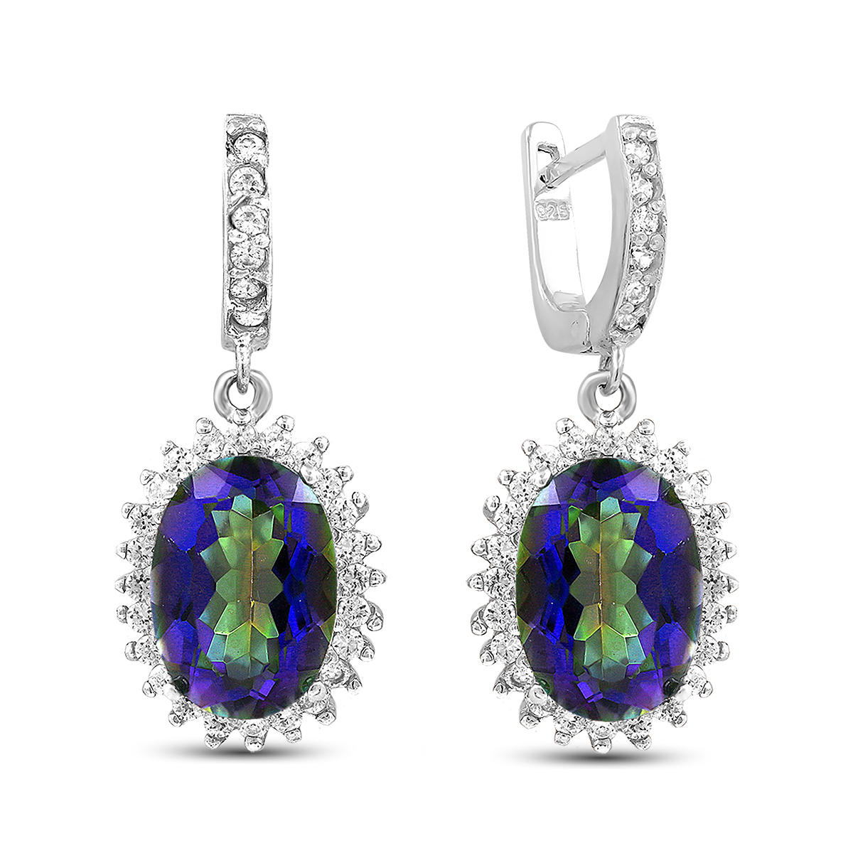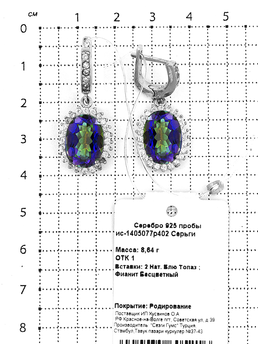 Серьги из серебра с нат.блю топазом и фианитами родированные
