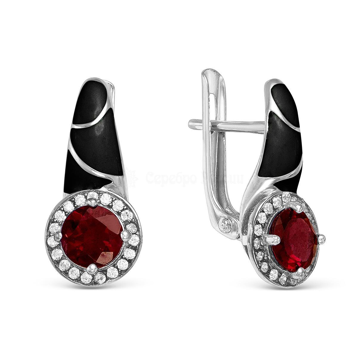 Серьги из серебра с нат.гранатом, куб.цирконием и эмалью родированные
