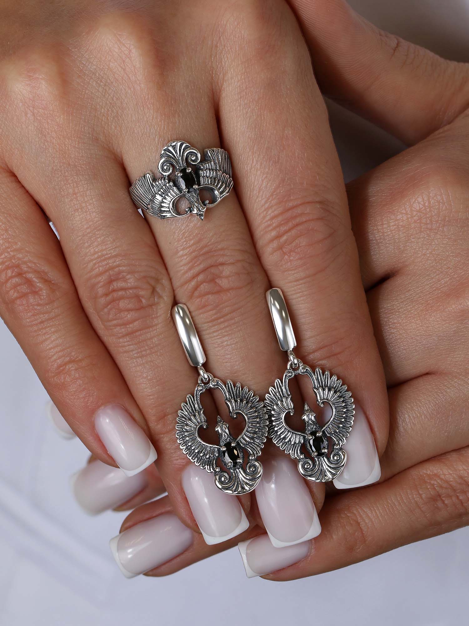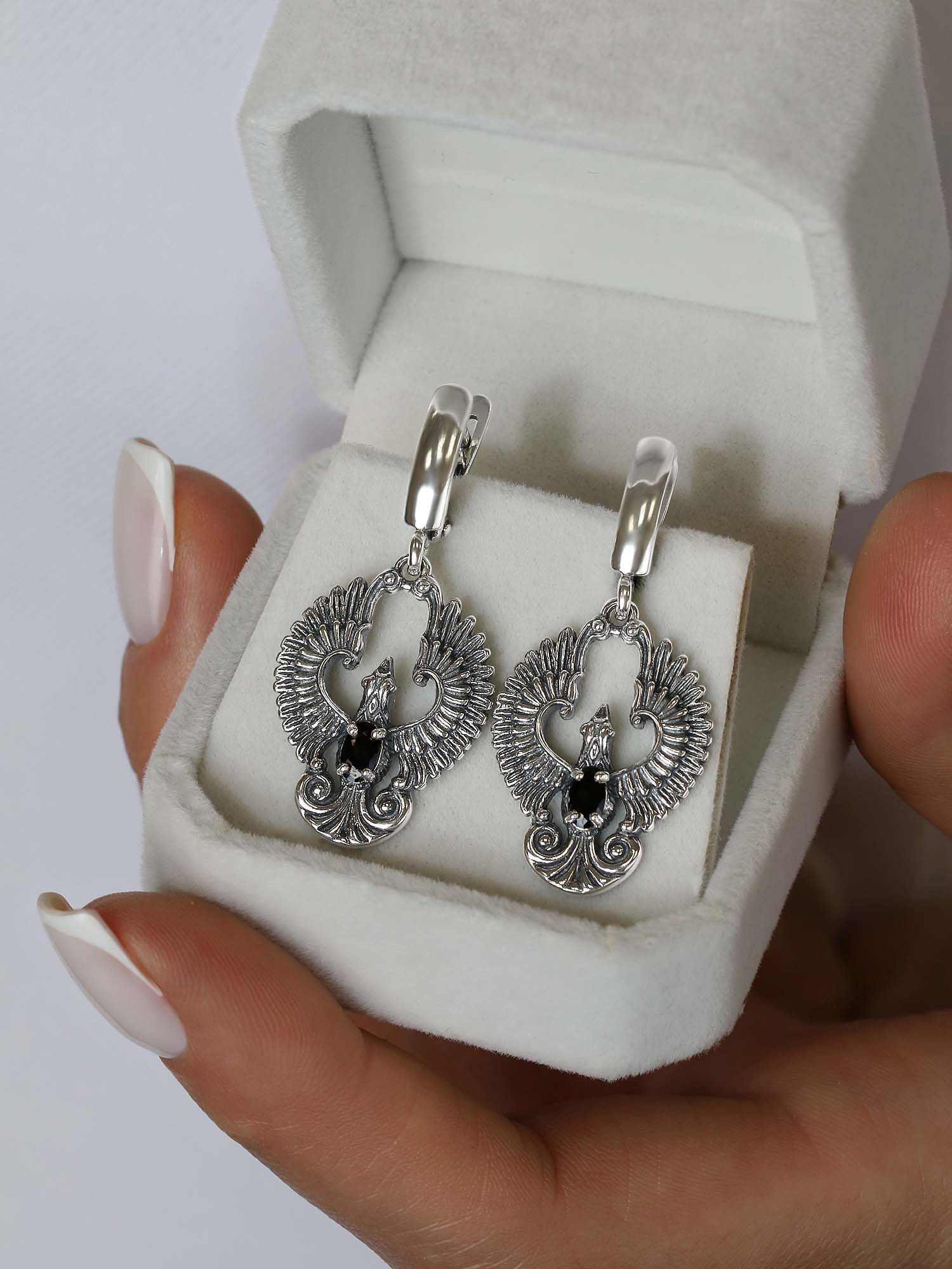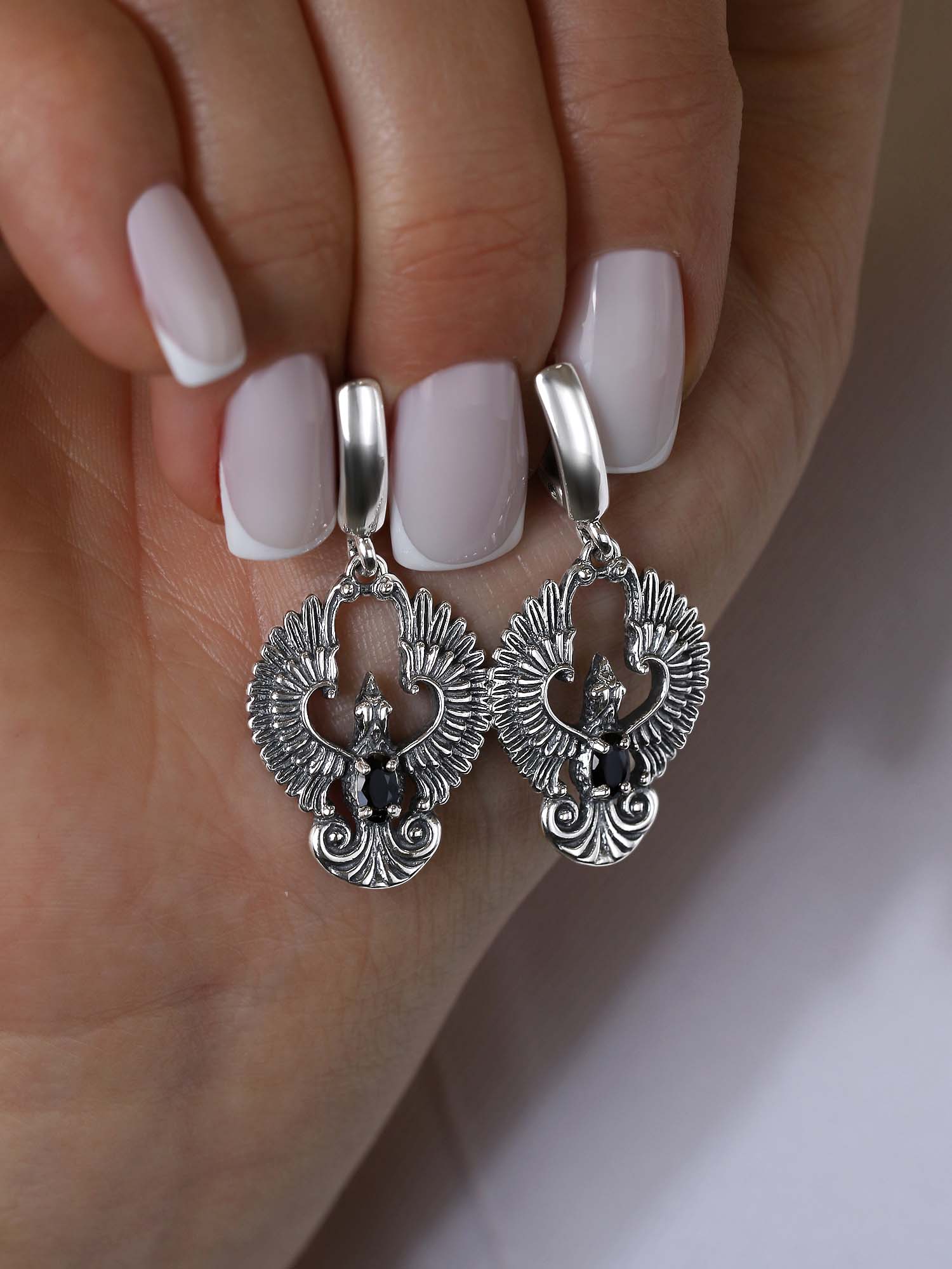 Серьги из чернёного серебра с натуральным чёрным ониксом - Птица Феникс