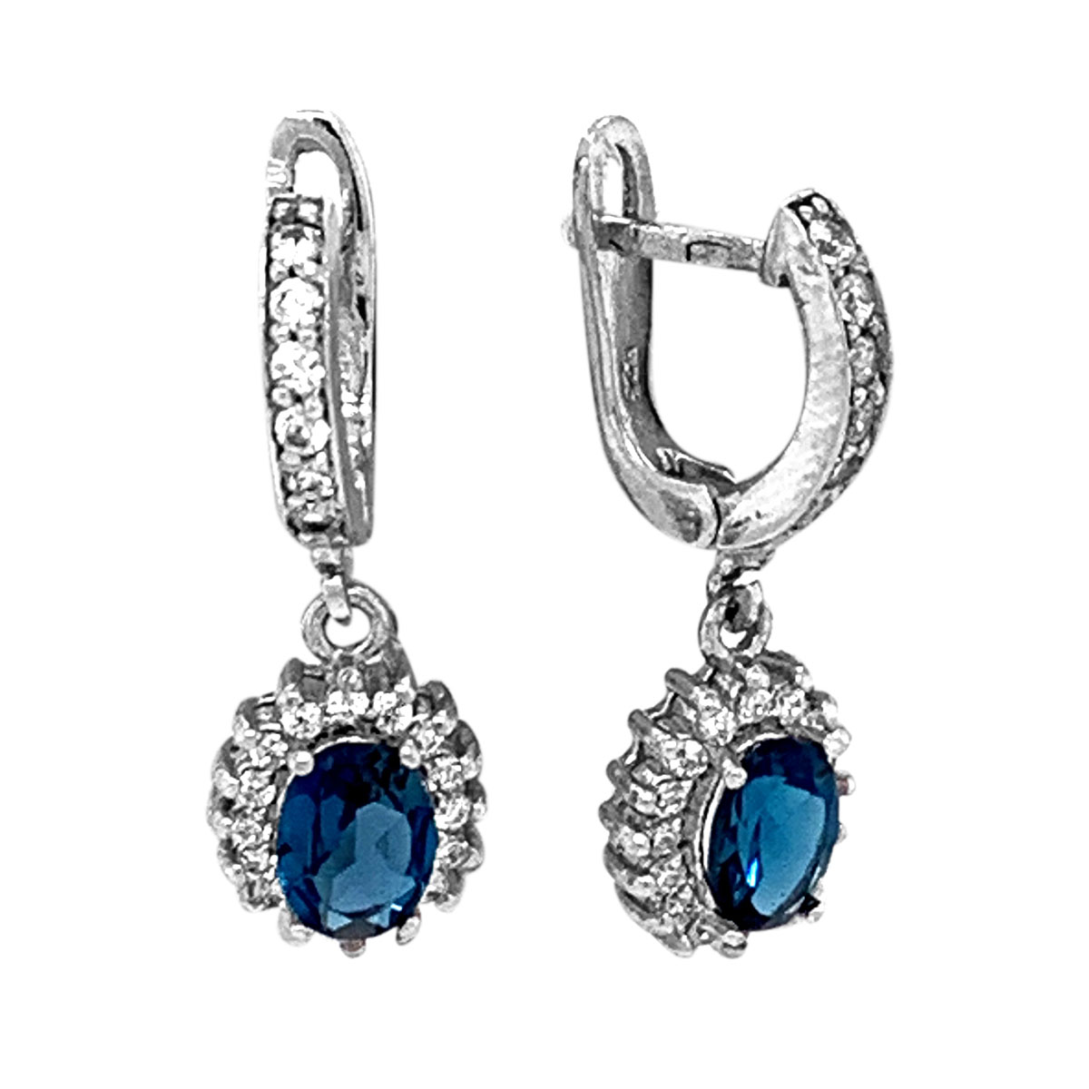 Серьги из серебра с нат.топазом лондон блю и фианитами родированные