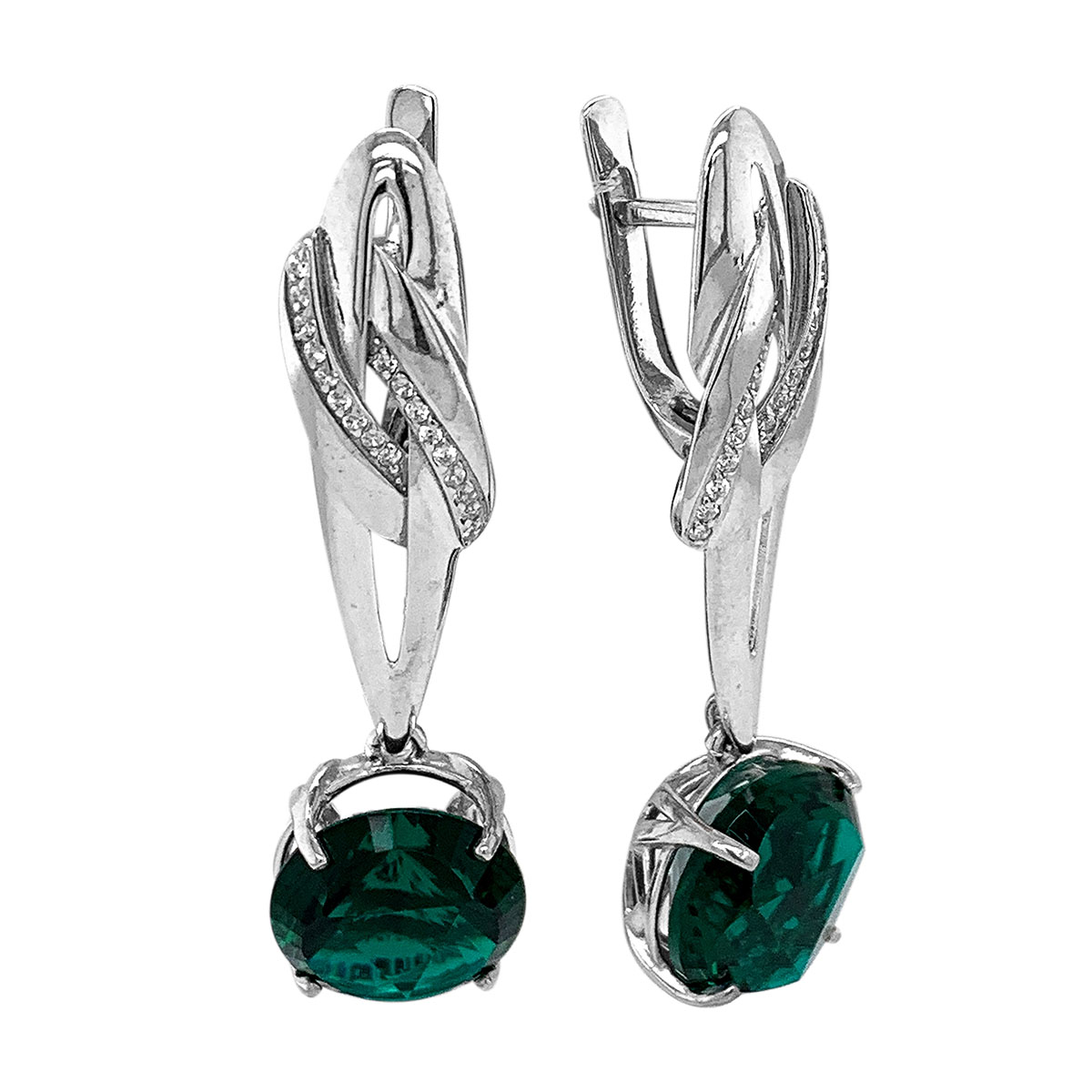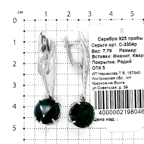 Серьги из серебра с пл.кварцем цв.изумруд и фианитами родированные